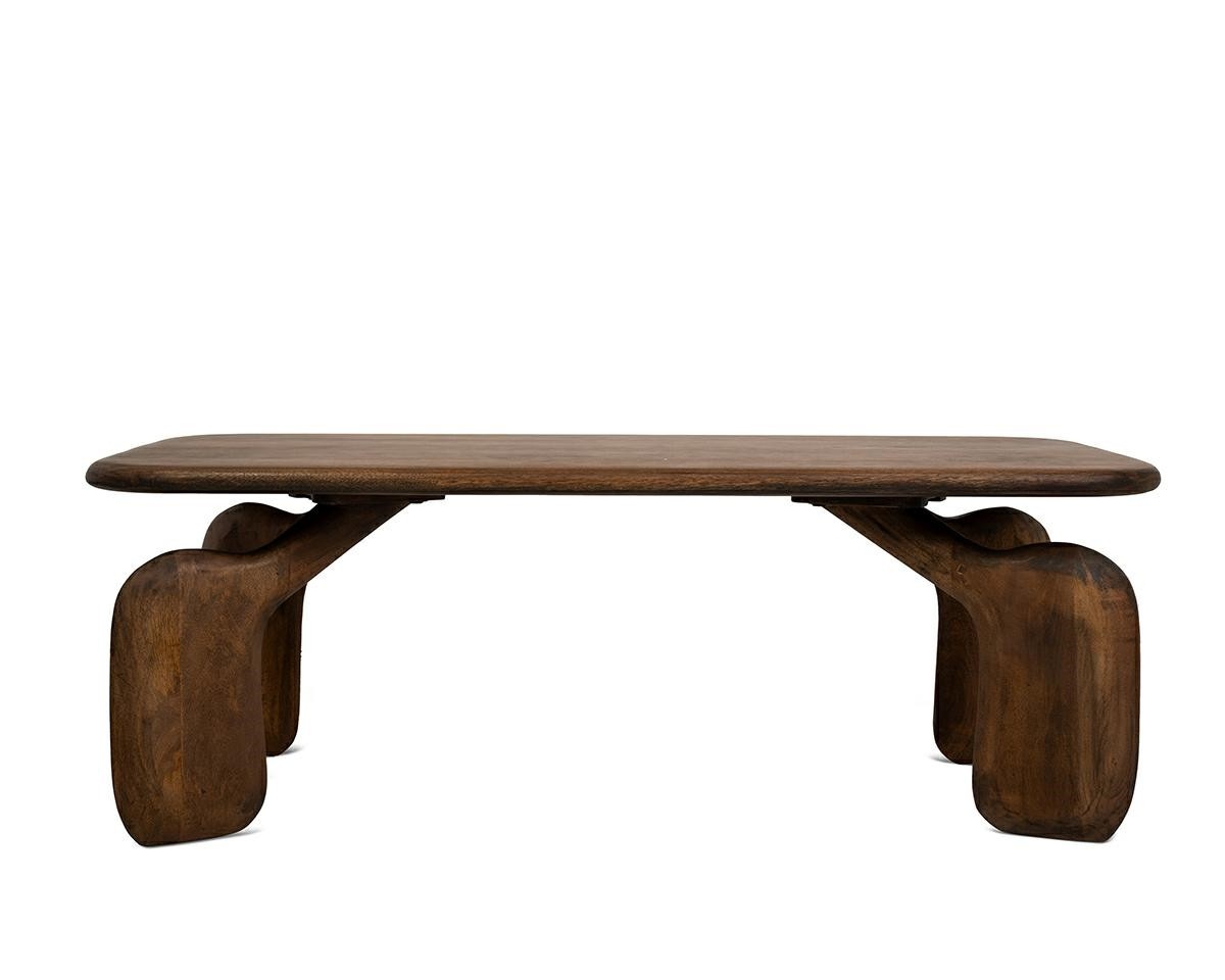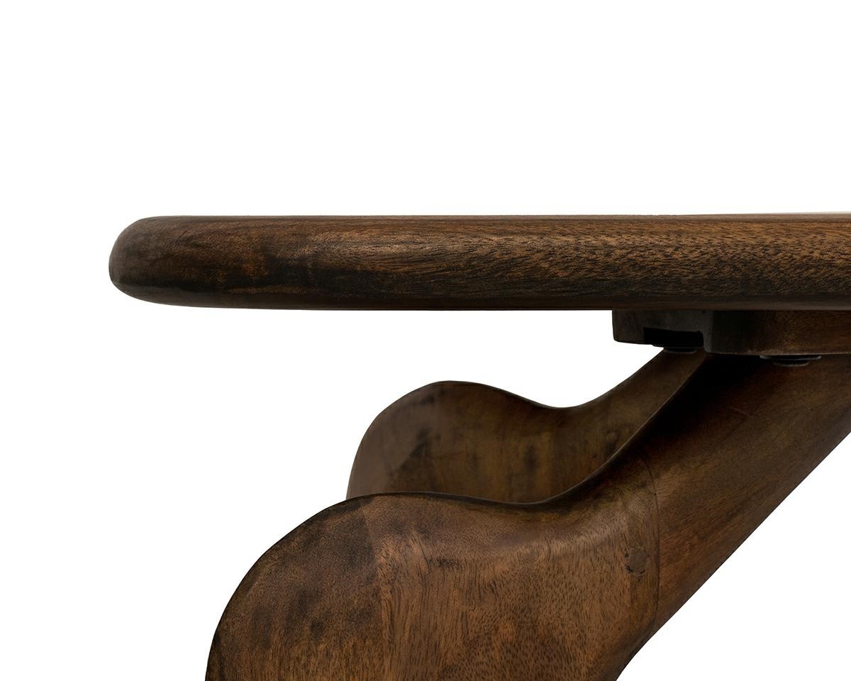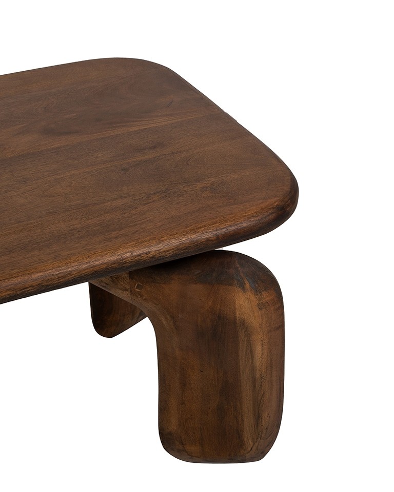 W całości wykonany z litego drewna mango, zachwyca naturalnym usłojeniem, które nadaje każdemu egzemplarzowi unikalny charakter. Ciepły, głęboki brąz podkreśla elegancję materiału i wprowadza do wnętrza przytulną, organiczną atmosferę. Blat o zaokrąglonych krawędziach miękko kontrastuje z dynamiczną linią podstawy, która przyciąga uwagę geometrycznym, wręcz rzeźbiarskim kształtem.