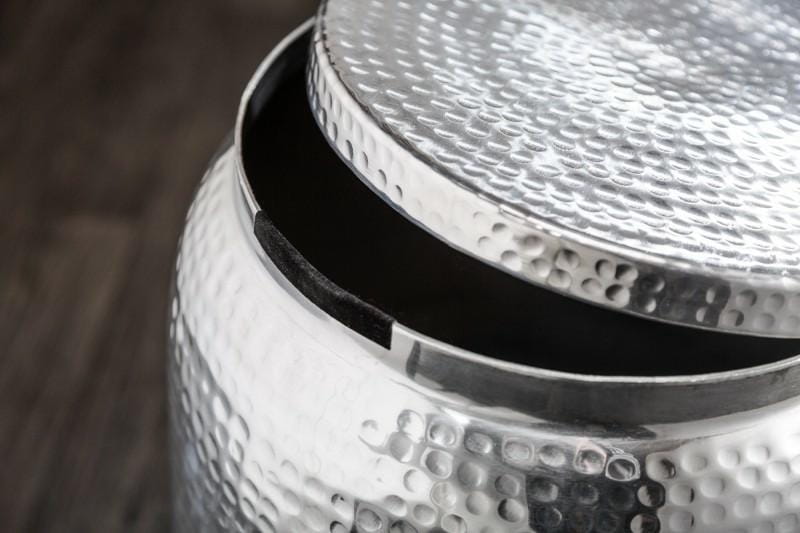 Elegancki stolik kawowy Orient Storage 35 marki Invicta interior w kolorze chromu. Oryginalny stolik został wykonany ze stopu metalowo-aluminiowego. Kształtem przypomina duży słoik. Precyzja wykonania oraz srebrny kolor będzie pięknie prezentować się jako dodatek do salonu czy sypialni. Dzięki blatu, który można zdejmować stolik zyskuje dodatkową przestrzeń na przechowywanie drobiazgów np. koców.