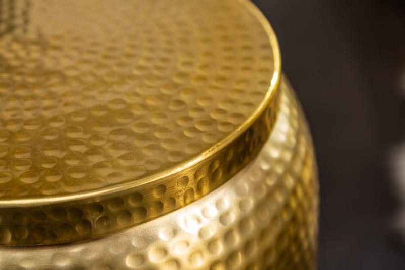 Elegancki stolik kawowy Orient Storage 35 marki Invicta interior w złotym kolorze. Oryginalny stolik został wykonany ze stopu metalowo-aluminiowego. Kształtem przypomina duży słoik. Precyzja wykonania oraz złoty kolor będzie pięknie prezentować się jako dodatek do salonu czy sypialni. Dzięki blatu, który można zdejmować stolik zyskuje dodatkową przestrzeń na przechowywanie drobiazgów np. koców.
