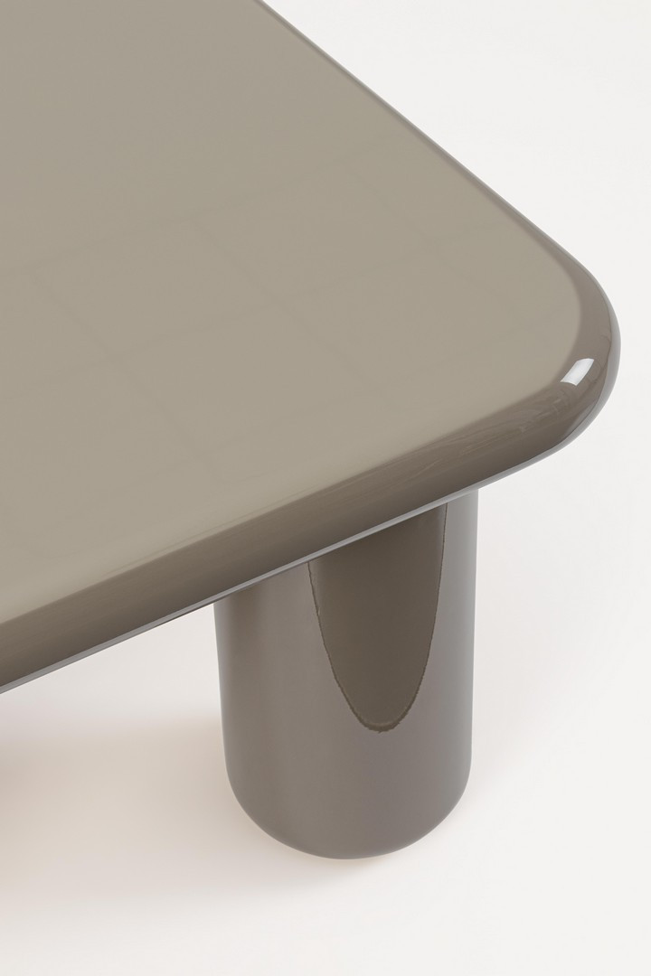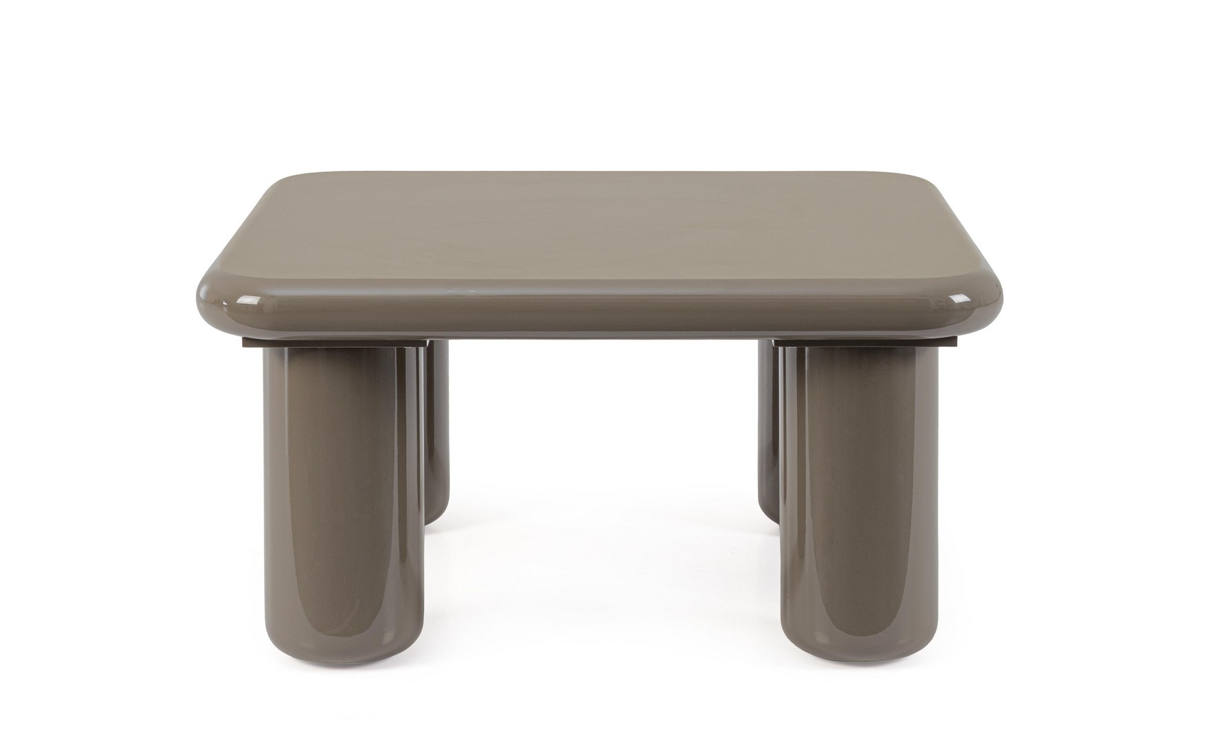 Stolik kawowy Otilia w modnym, neutralnym odcieniu ziołowego brązu to przykład minimalistycznego wzornictwa z elementami organicznymi. Charakteryzuje go solidny, kwadratowy blat z łagodnie zaokrąglonymi krawędziami oraz cztery masywne, cylindryczne nogi, które nadają bryle miękkości i nowoczesności. Powierzchnia mebla została wykończona wysokopołyskowym lakierem poliuretanowym, co zapewnia elegancki blask i ułatwia codzienną pielęgnację.