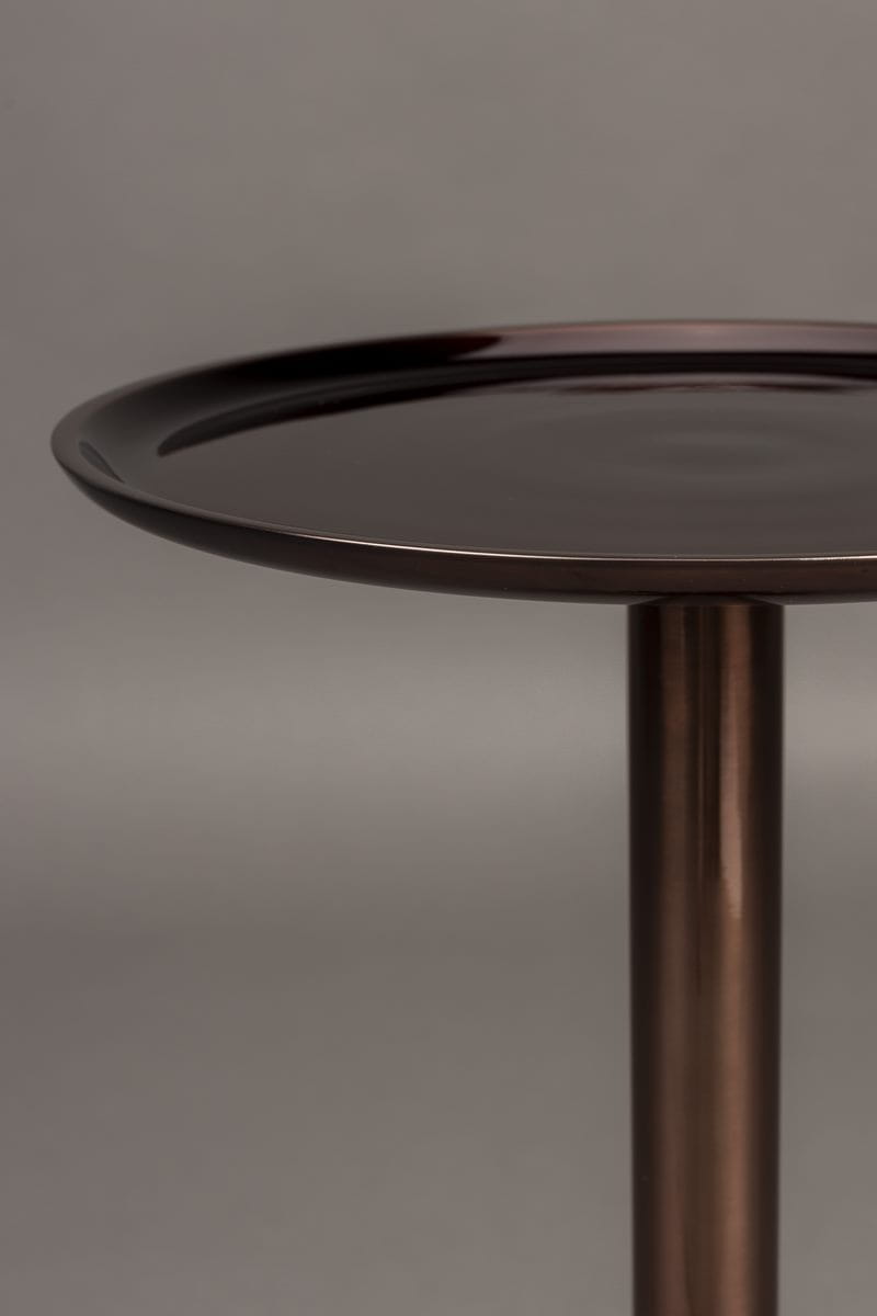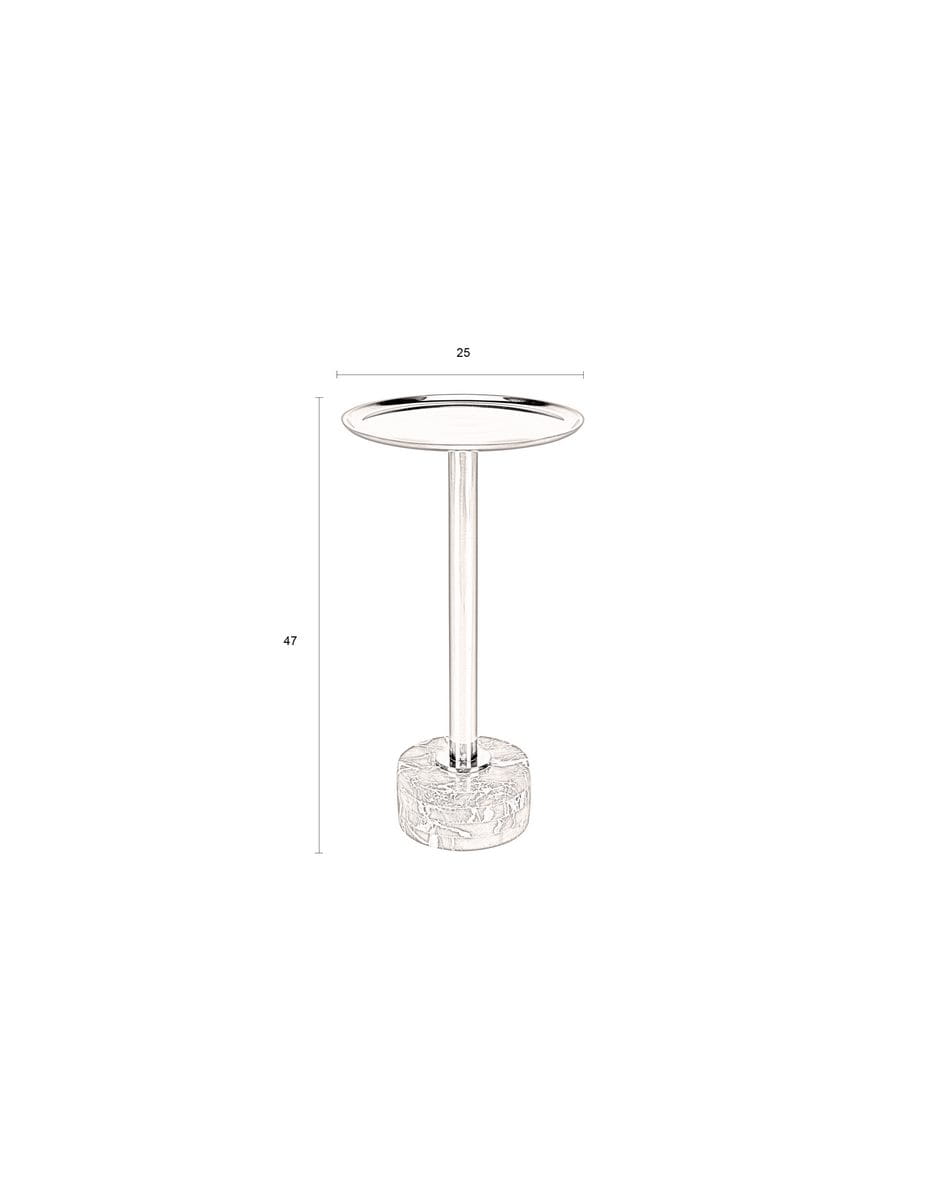 Blat i noga wykonane zostały z aluminium i ich lekka forma kontrastuje z masywnym, marmurowym kamieniem. Okrągły blat o podwyższonej krawędzi ma niewielką średnicę, przez co stolik idealnie sprawdzi się samodzielnie, jako stolik boczny lub stworzy będzie efektownym elementem zestawu stolików kawowych. Stworzy świetną kompozycję w stylu vintage ze stolikami Mount.