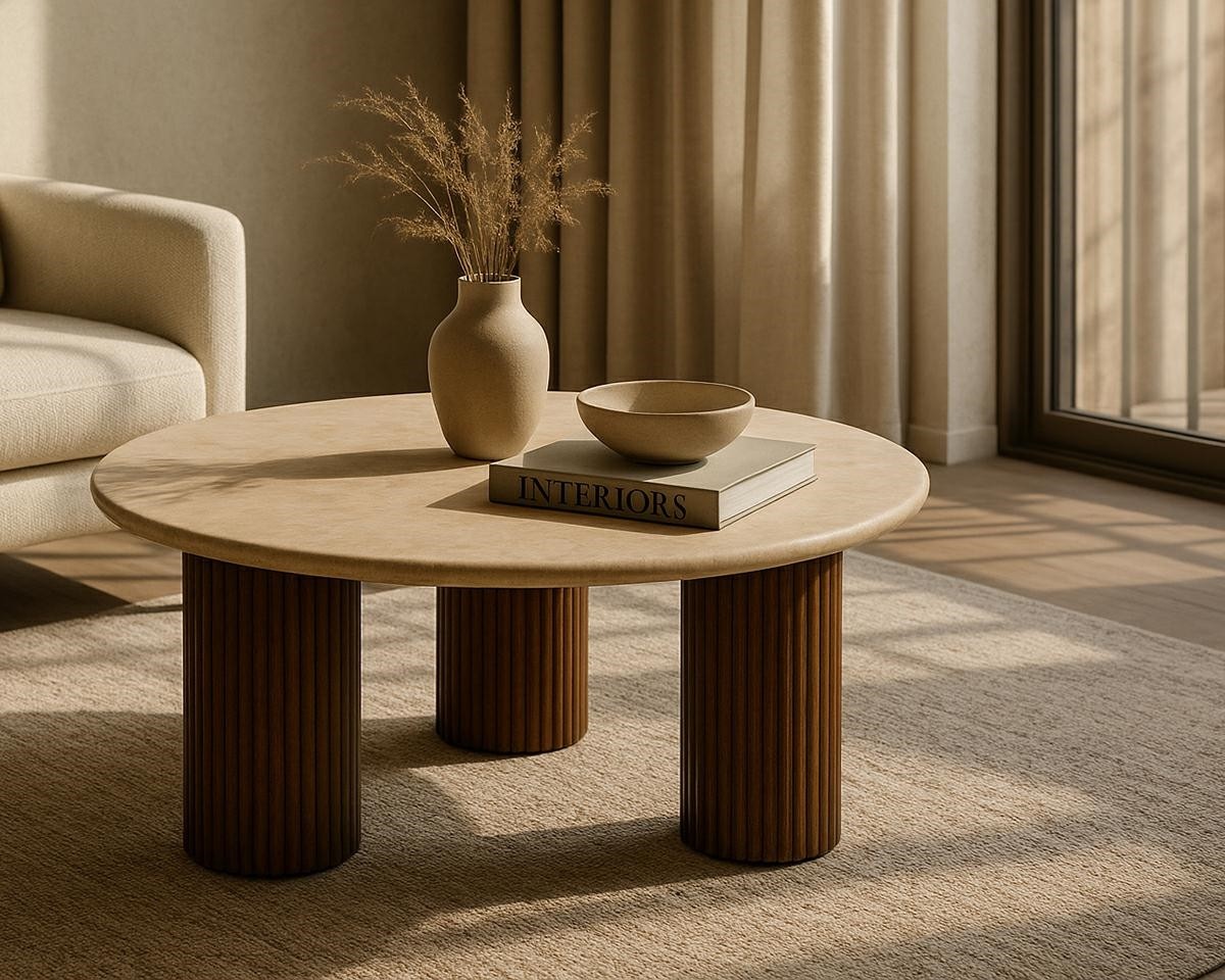 Podstawa stolików wykonana została z litego drewna mango w ciepłym, brązowym odcieniu. Rytmiczne, pionowe żłobienia dodają jej struktury i rzeźbiarskiego charakteru, przywodząc na myśl kolumny w klasycznej architekturze, ale w nowoczesnej, minimalistycznej interpretacji. To właśnie ten detal czyni Ragno stolikiem, który doskonale odnajdzie się zarówno w przestrzeniach o charakterze retro, jak i w nowoczesnych czy japandi wnętrzach.