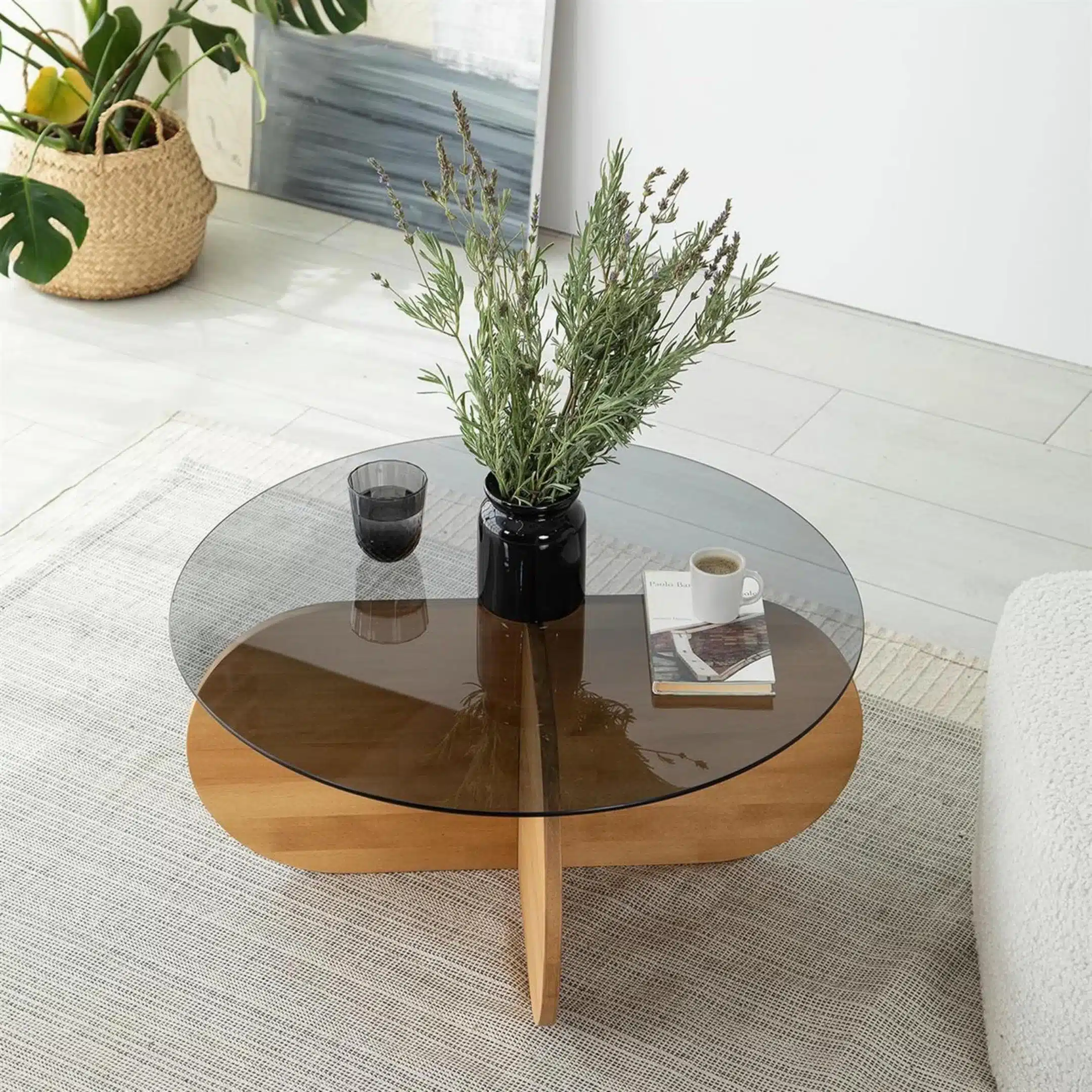 Blat wykonany z hartowanego, przeźroczystego szkła nie tylko dodaje stolikowi lekkości, ale jest także niezwykle wytrzymały i odporny na zarysowania oraz uszkodzenia. Połączenie drewna i szkła gwarantuje trwałość i ponadczasowy design.