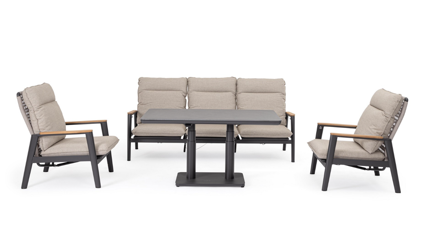 Stół ogrodowy Miguel to kwintesencja innowacyjnego designu i wszechstronnej funkcjonalności, stworzona z myślą o nowoczesnych przestrzeniach zewnętrznych. Solidna konstrukcja opiera się na ramie z aluminium malowanego proszkowo (poliester) w eleganckim, antracytowym kolorze, co gwarantuje wysoką odporność na warunki atmosferyczne i korozję. Wyjątkowym elementem mebla jest blat wykonany z kamienia spiekanego o grubości 11 mm – naturalnego materiału formowanego w wysokich temperaturach, który charakteryzuje się niezwykłą trwałością oraz piękną, nowoczesną fakturą.