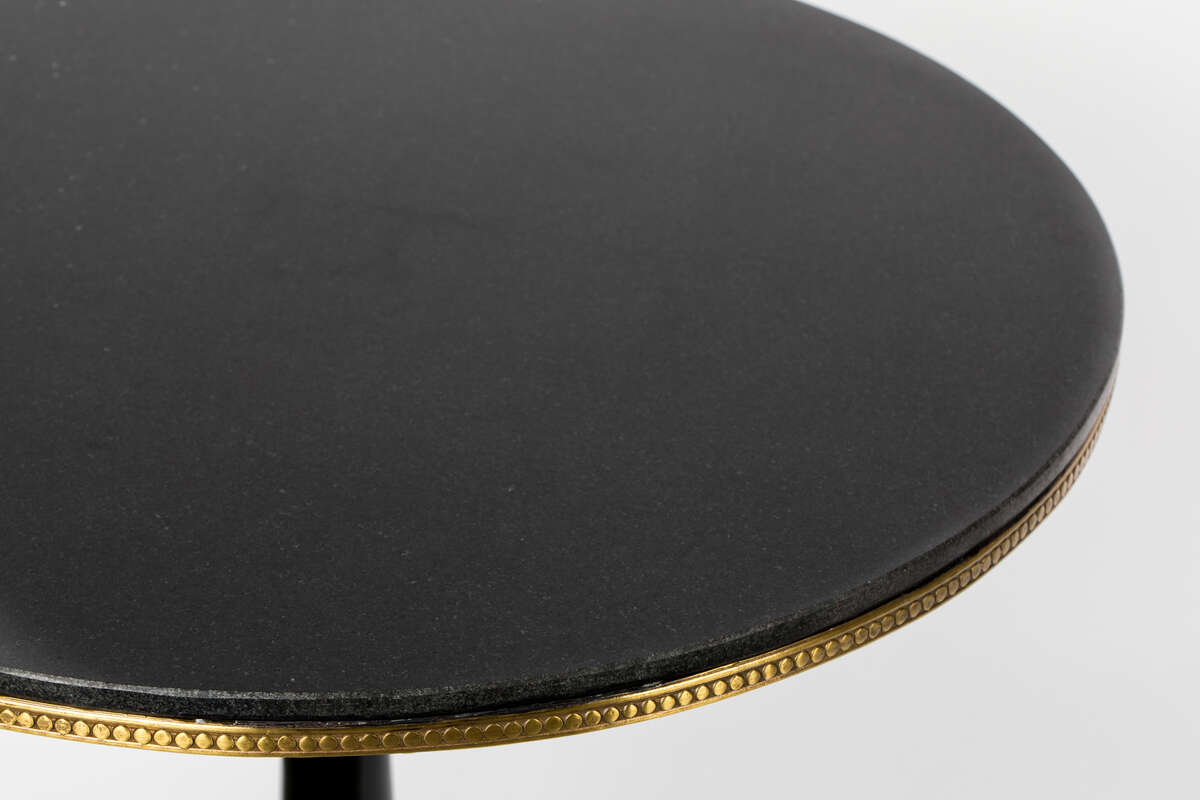 Okrągły stolik OWN THE GLOW z granitowym blatem i elegancką, zdobioną nogą.