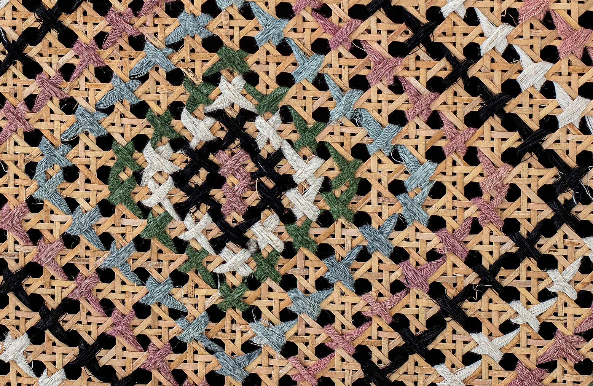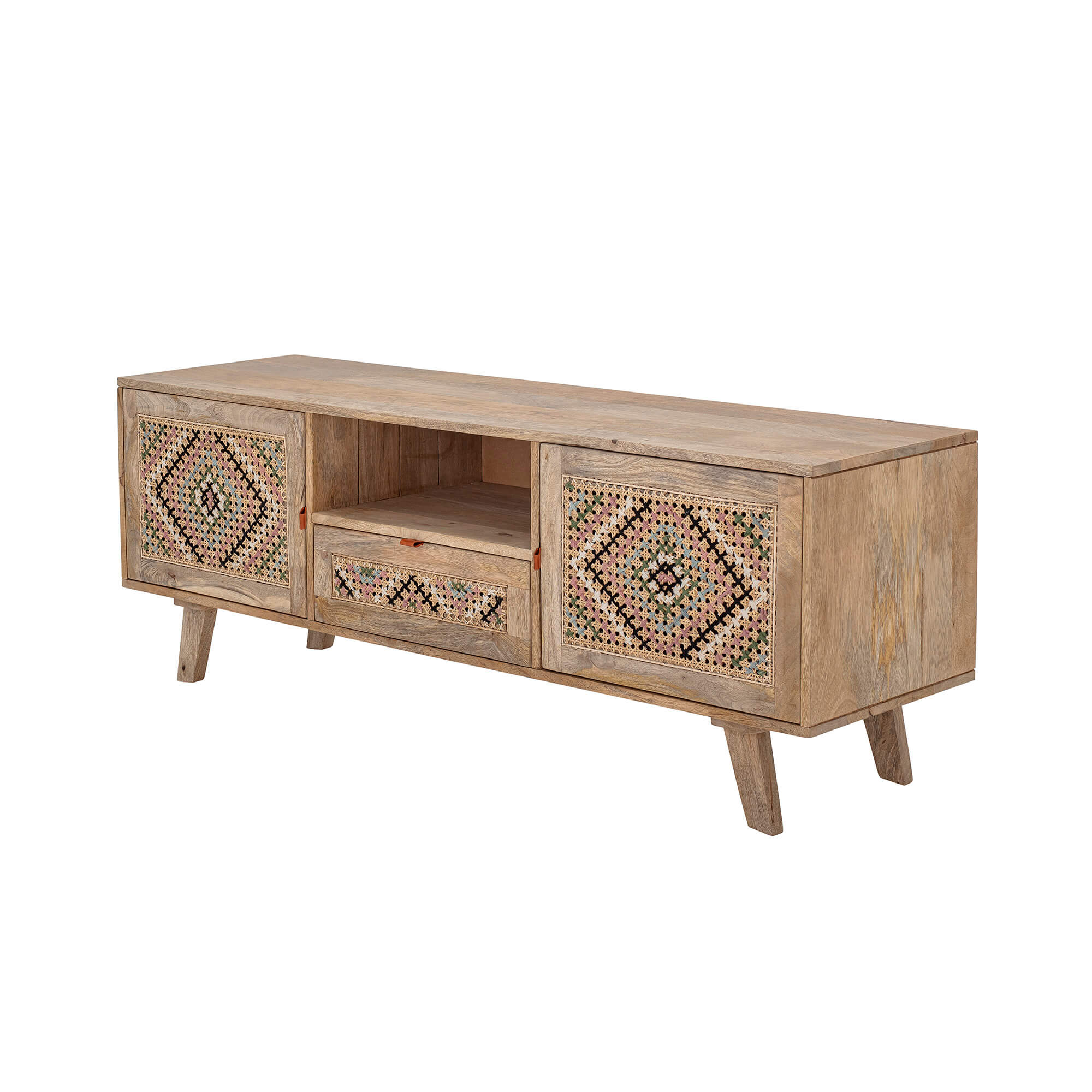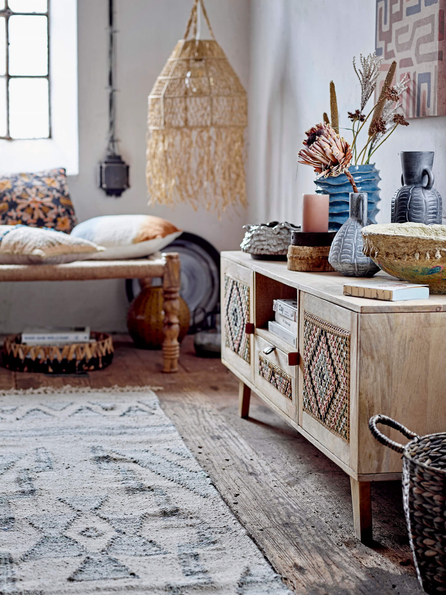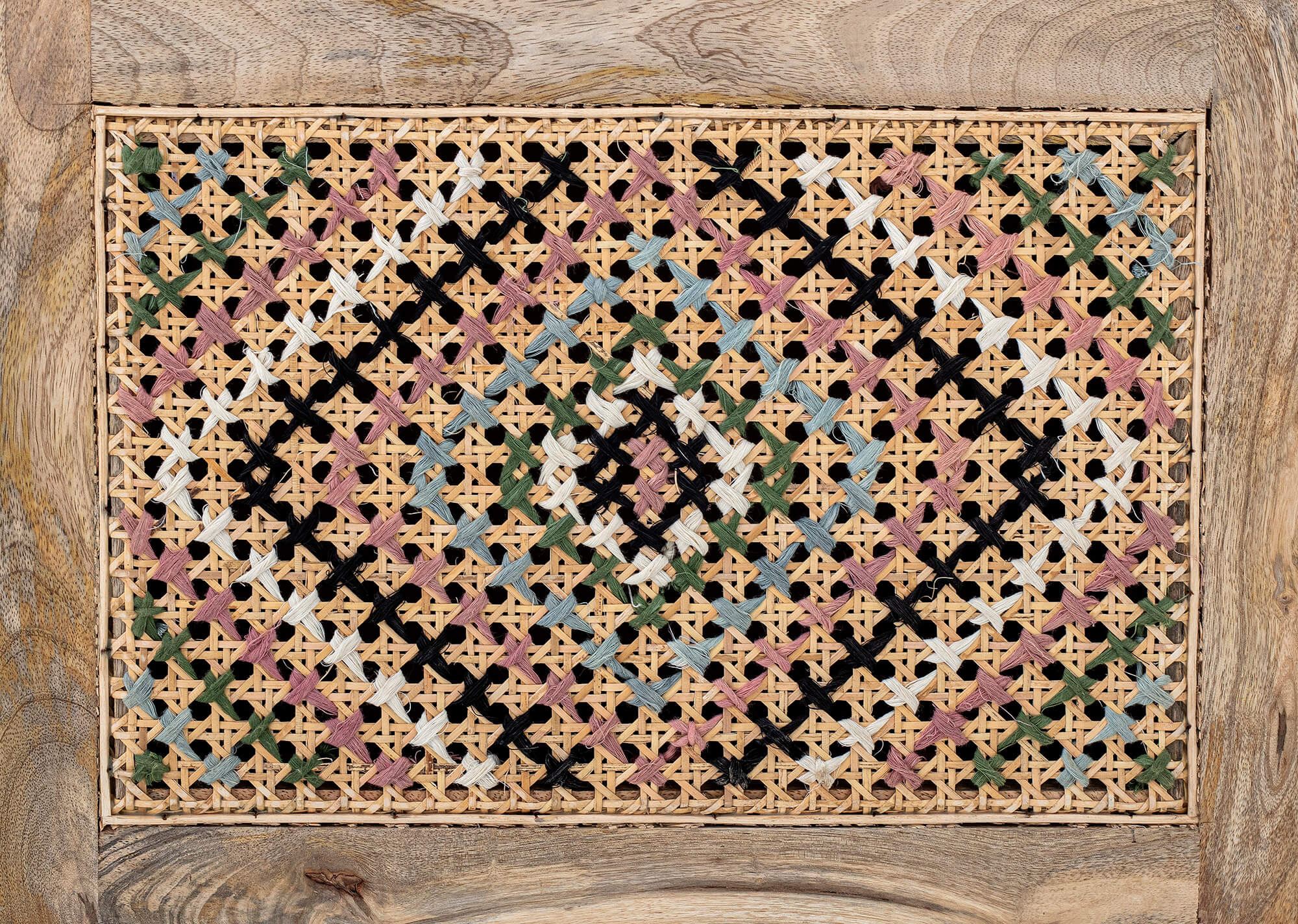 Wykonana z drewna mango, szafka posiada na drzwiczkach piękny, pastelowy wzór z bawełnianego sznurka, który przyciąga uwagę i dodaje charakteru.