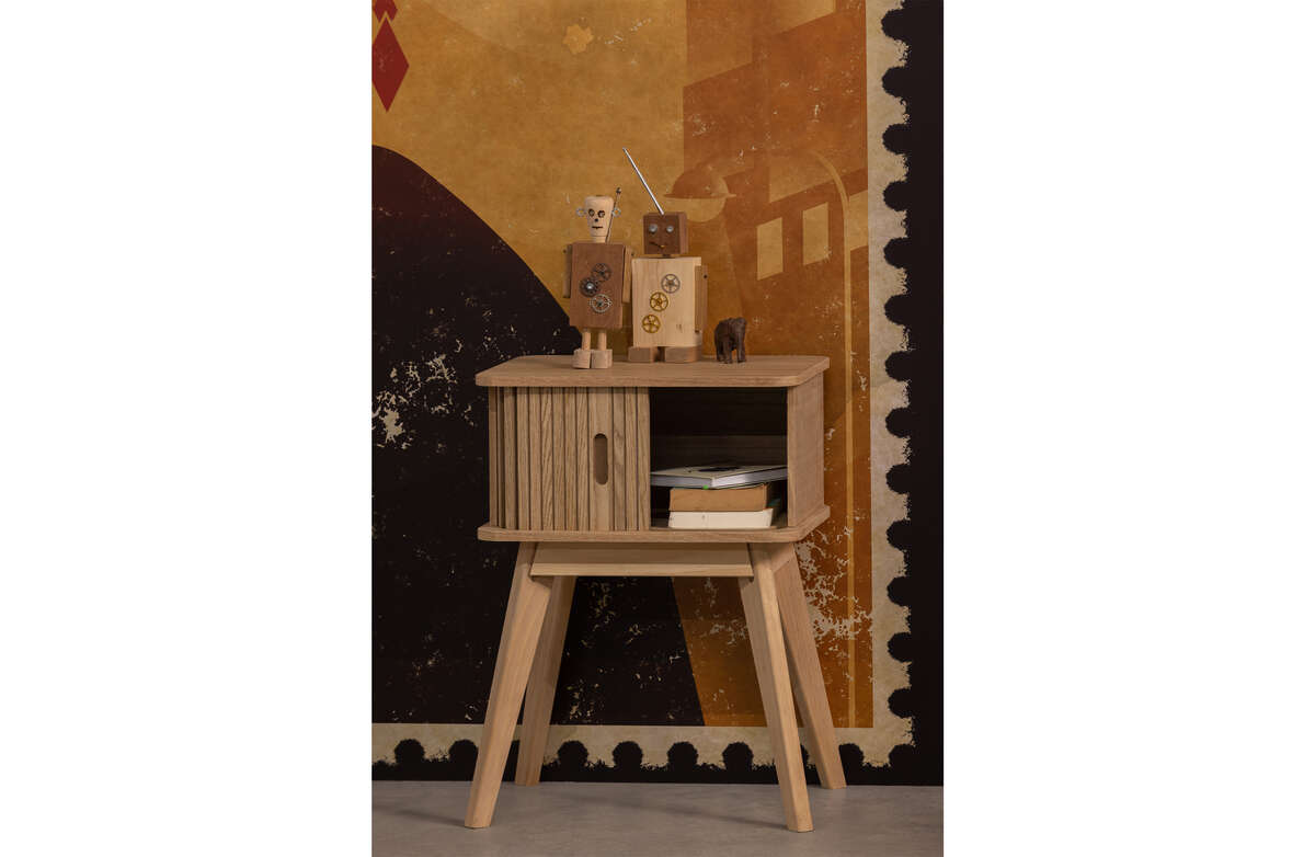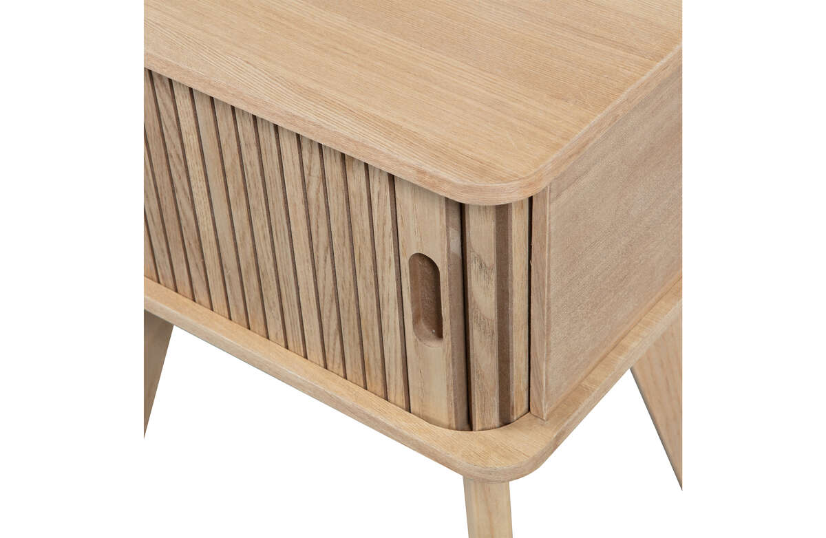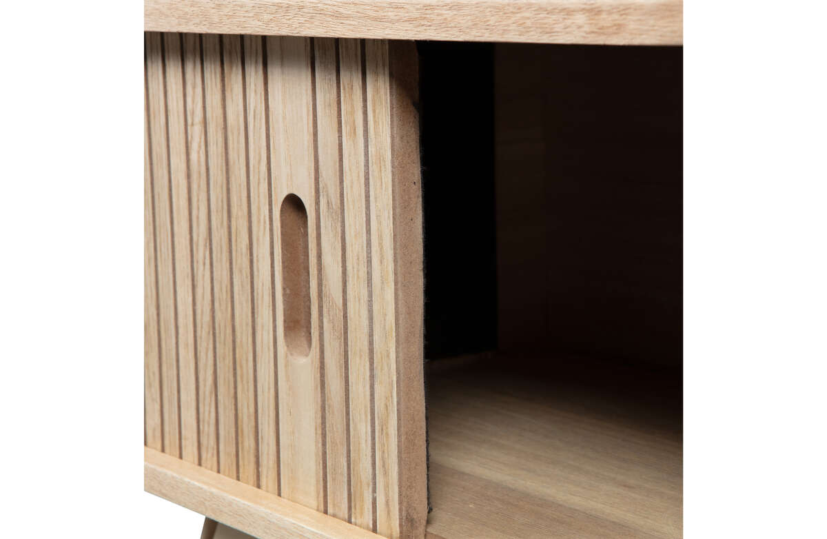 Charakterystycznym elementem szafki Marla są ryflowane, przesuwane drzwiczki, które nadają meblowi unikalnego charakteru. Drewno sosnowe użyte do produkcji szafki posiada certyfikat FSC, co świadczy o zrównoważonym i odpowiedzialnym zarządzaniu zasobami leśnymi. Różne metody obróbki drewna, takie jak szlifowanie, szczotkowanie czy piłowanie taśmowe, nadają meblowi różnorodny wygląd – od gładkiego i schludnego po surowy i wyrazisty. Jasny odcień i widoczne ślady "płomieni" podkreślają autentyczność i naturalny urok drewna sosnowego.