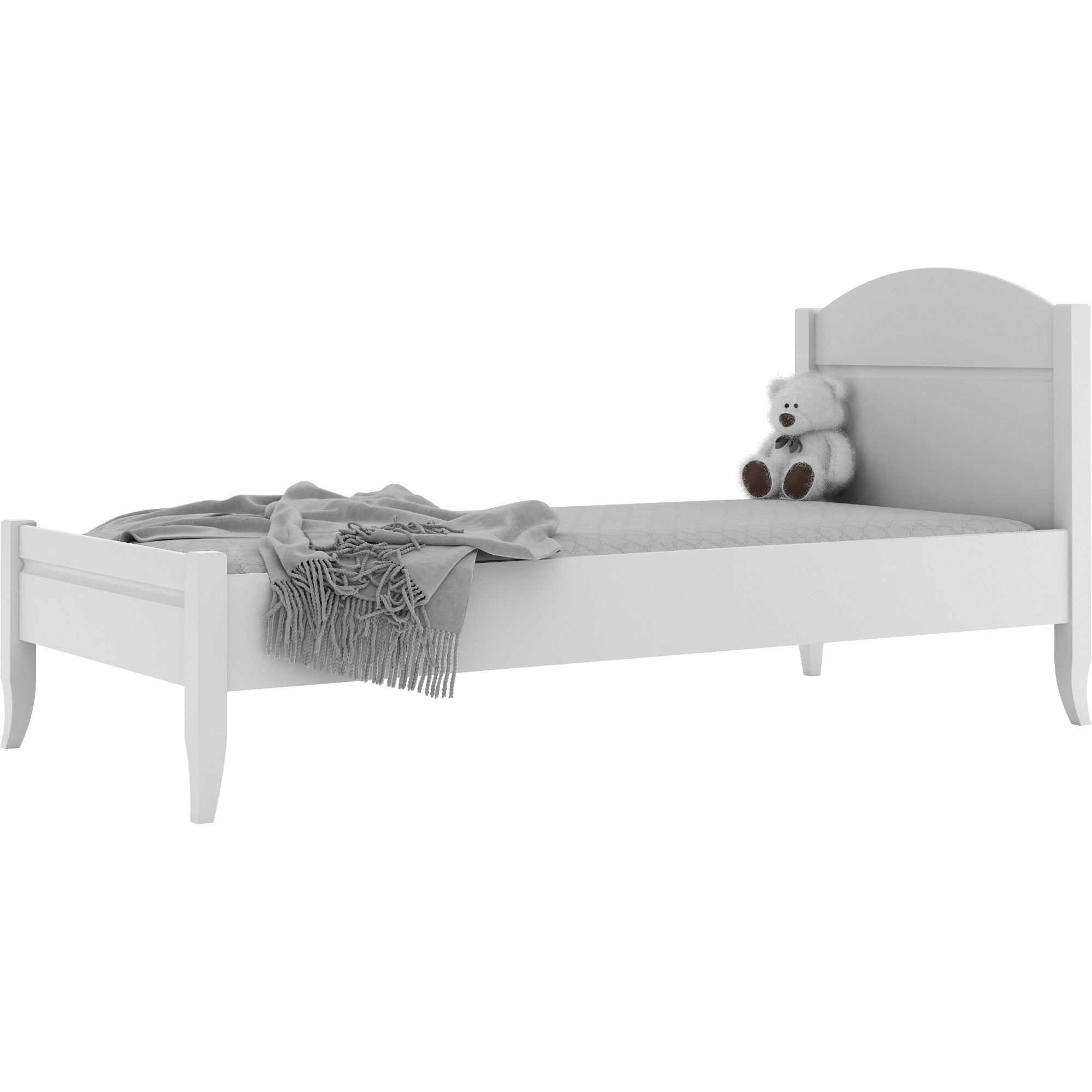 Solidne, wykonane z wysokiej jakości drewna pozyskiwanego z polskich nadleśnictw oraz płyty MDF łóżko dziecięce w stylu skandynawskim, jest synonimem jakości i niepowtarzalnego designu. Wykonane z dbałością o najmniejszy szczegół. Świadczą o tym precyzyjnie stylizowane nóżki oraz wszelkie ozdobne żłobienia, które nadają niezwykłej lekkości i elegancji. Zagłówek posiada charakterystyczną łukową linię i przyozdobiony jest frezem w linii prostej. Wysokość od stelaża do górnej linii boku to 14 cm.