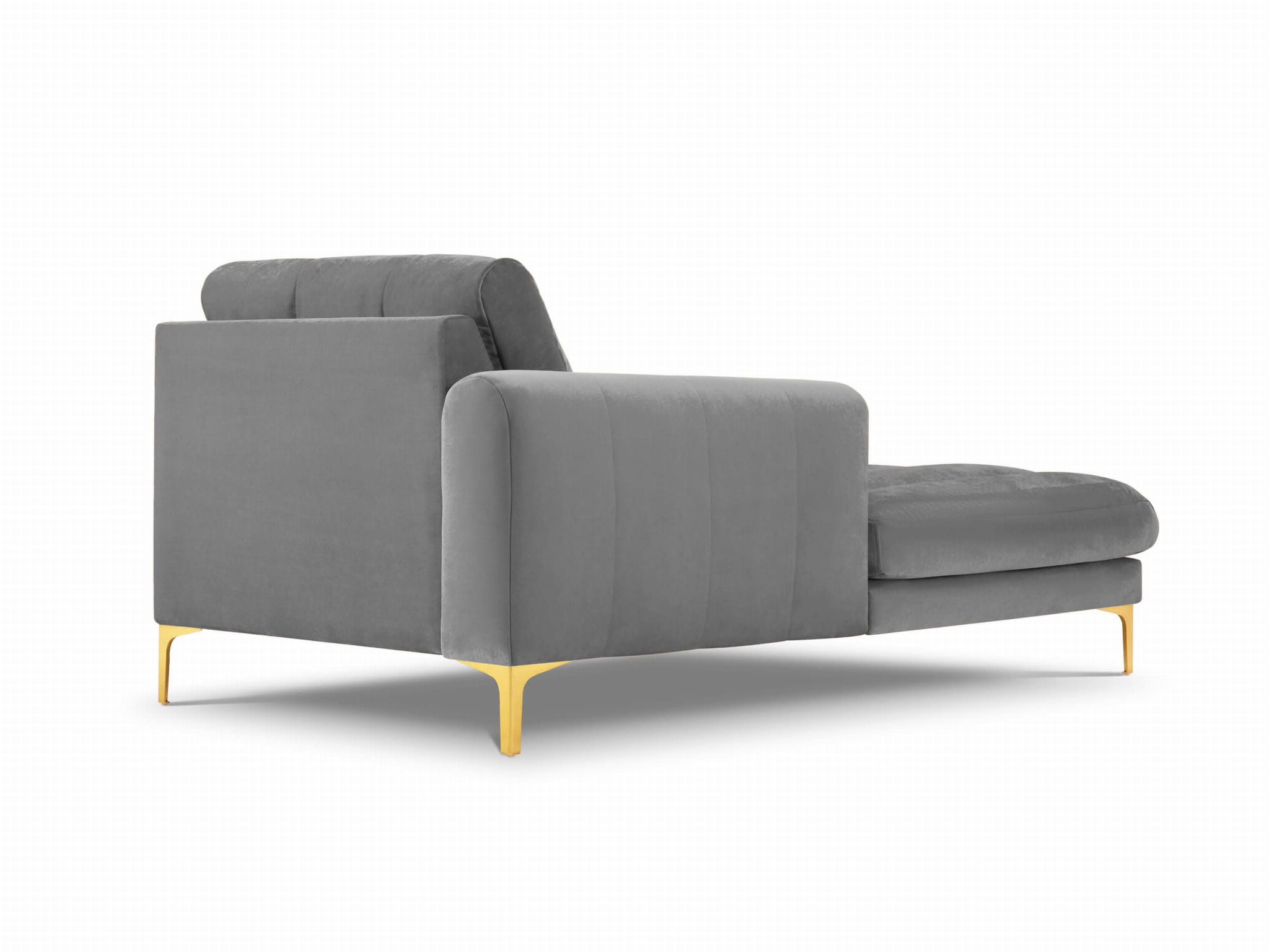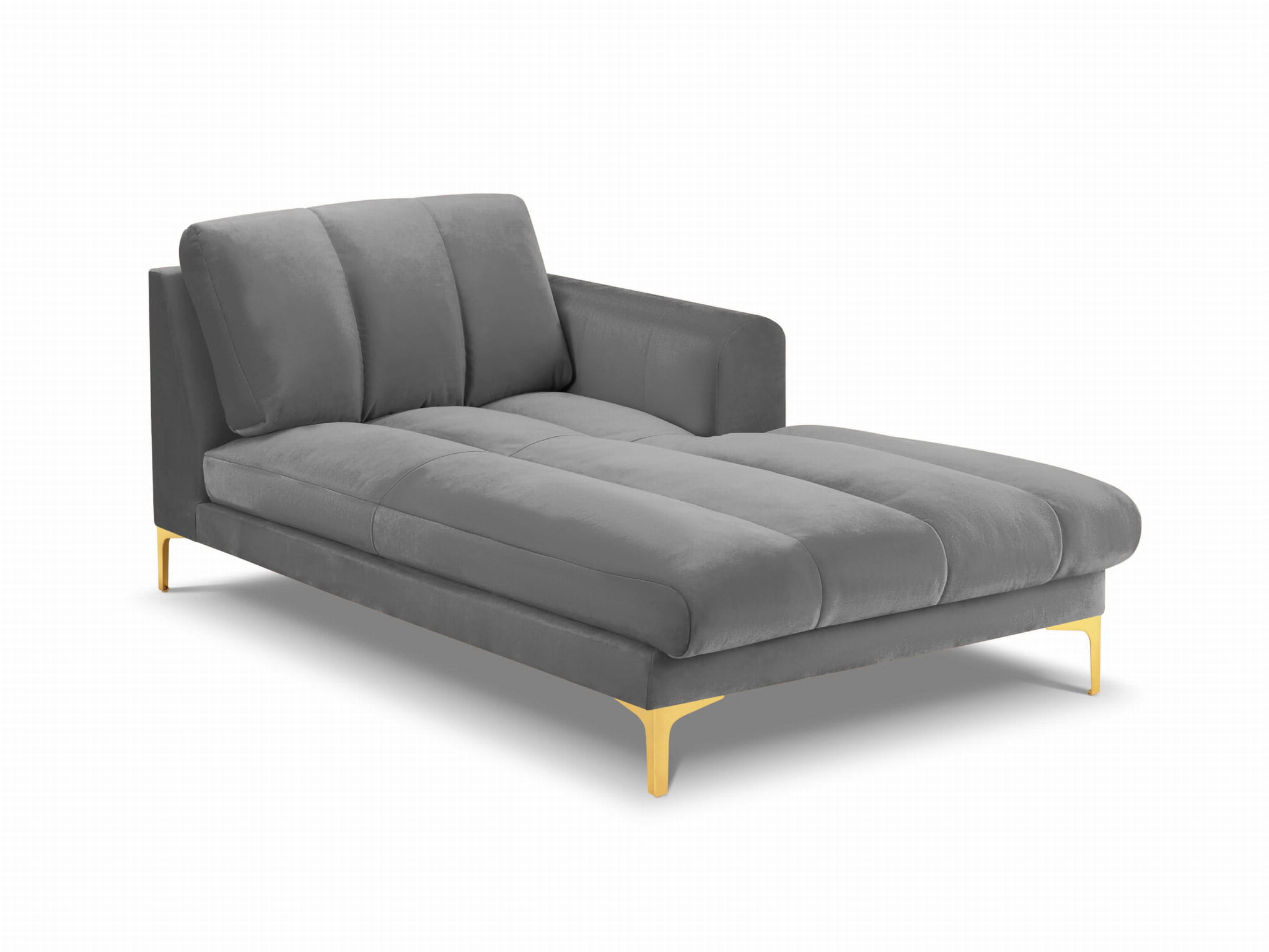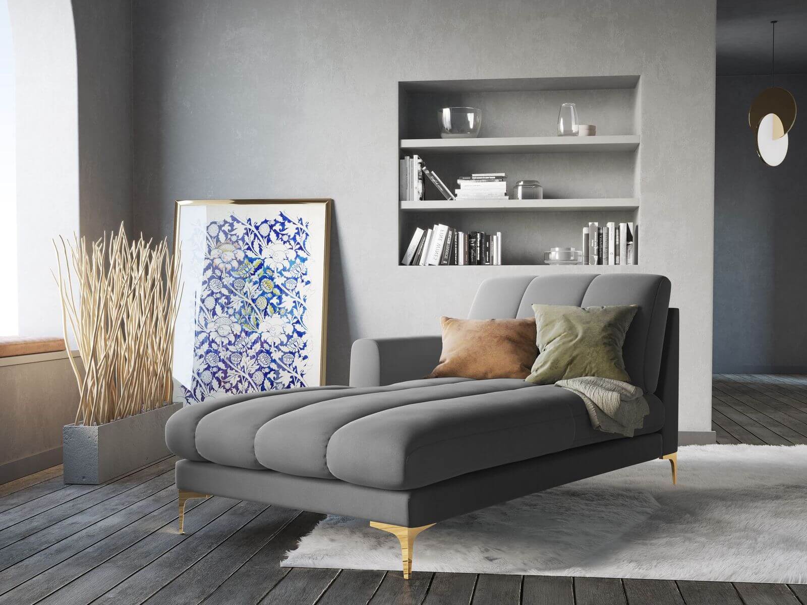 Szezlong Gina do salonu jasno szary aksamit na złotych nóżkach