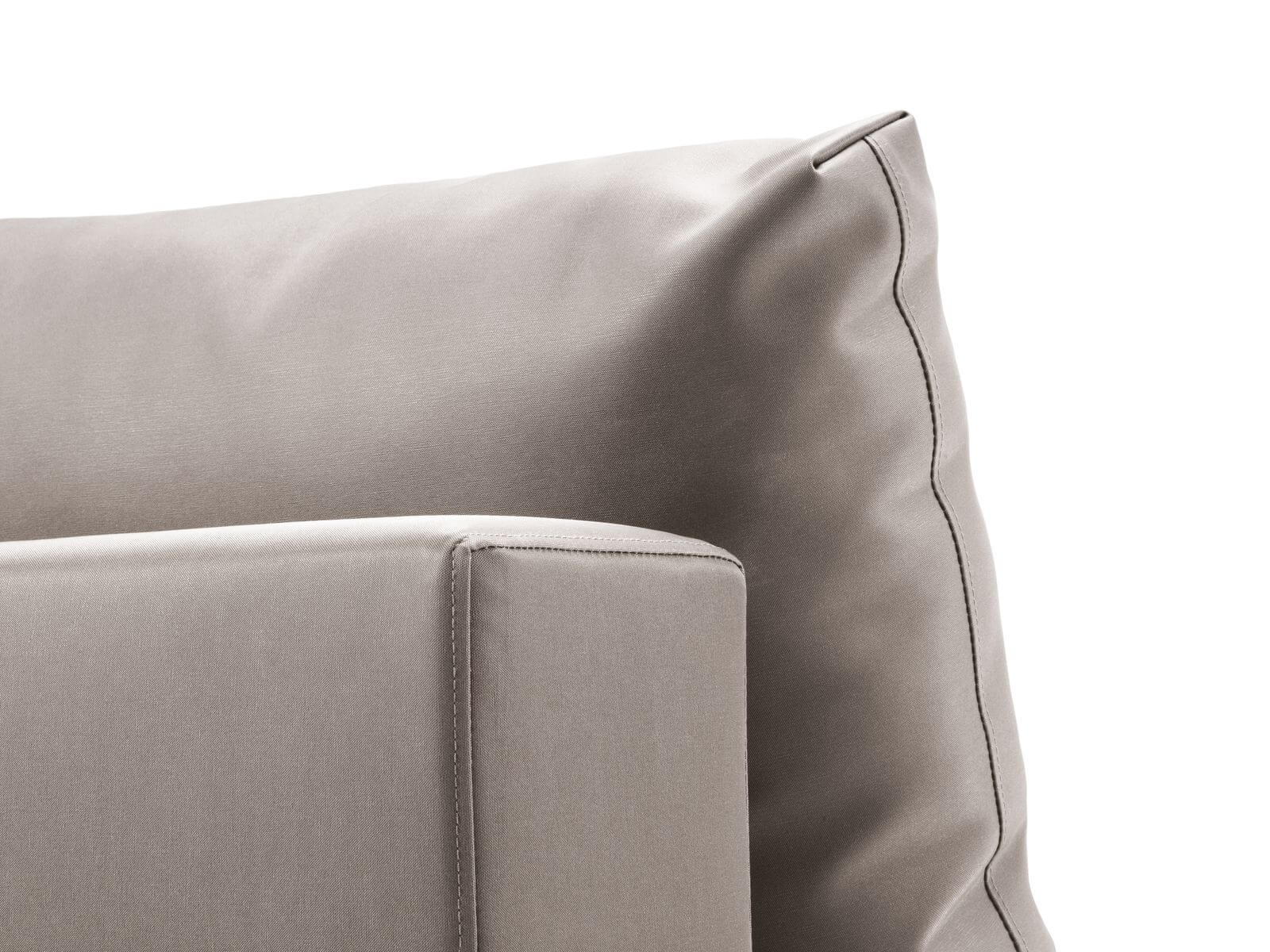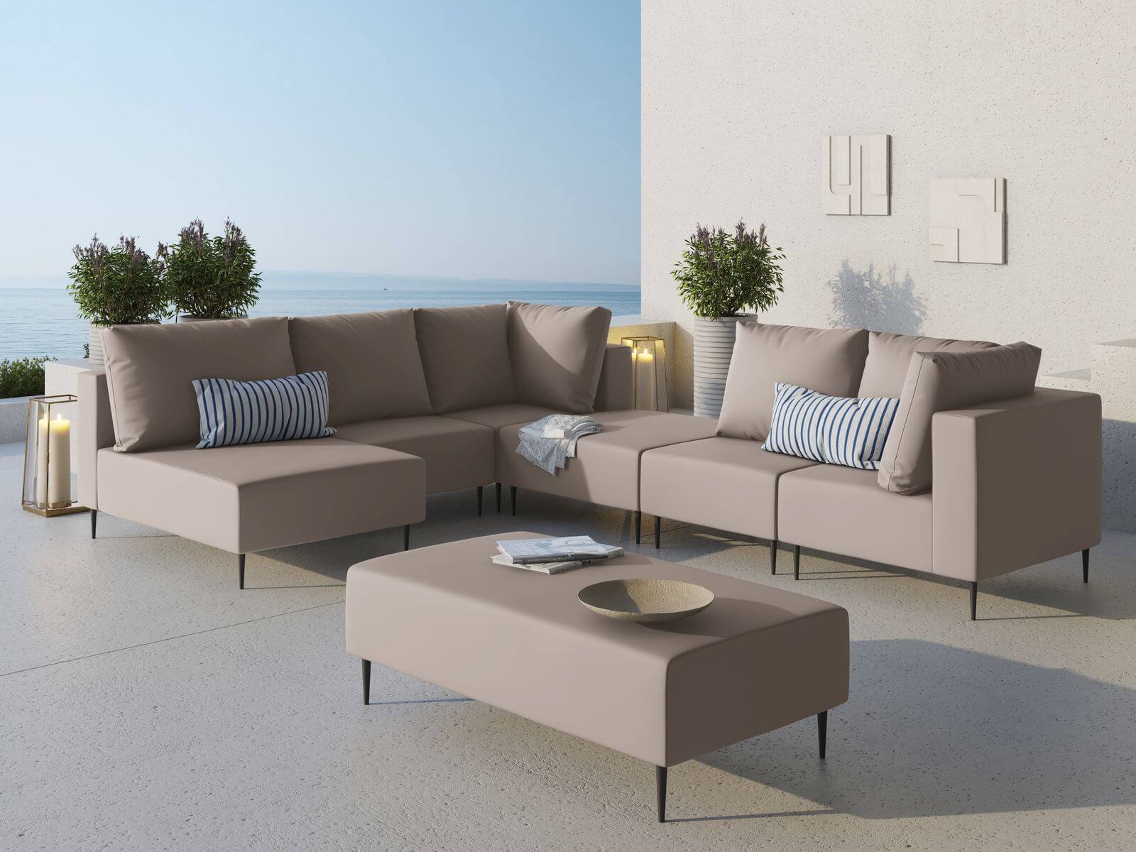 Nowoczesny szezlong ogrodowy pokryty jest beżową tkaniną Vinylpex (kolor W08), która posiada powłokę hydrofobową, zapobiegającą wchłanianiu płynów. Ponadto materiał jest niezwykle odporny na ścieranie (test Martindale 102500, 695 g/m², skład powłoki: 95% PVC, 5% PU). Tkanina posiada powłokę antybakteryjną.