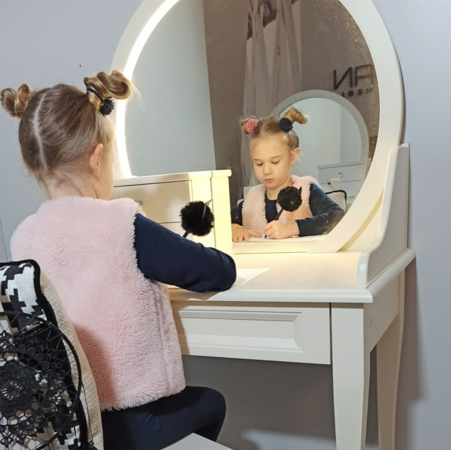 Elegancka toaletka Charlotte z dużym okrągłym lustrem emanuje wyszukanym stylem i jest doskonałym dodatkiem do Twojej sypialni lub pokoju dziecka. Zapewni nie tylko praktyczną powierzchnię użytkową ale również doda wyjątkowego uroku i luksusu do wnętrza.