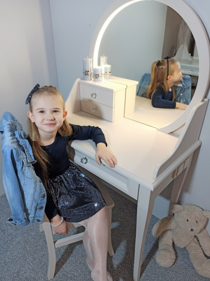 Elegancka toaletka Charlotte z dużym okrągłym lustrem emanuje wyszukanym stylem i jest doskonałym dodatkiem do Twojej sypialni lub pokoju dziecka. Zapewni nie tylko praktyczną powierzchnię użytkową ale również doda wyjątkowego uroku i luksusu do wnętrza.