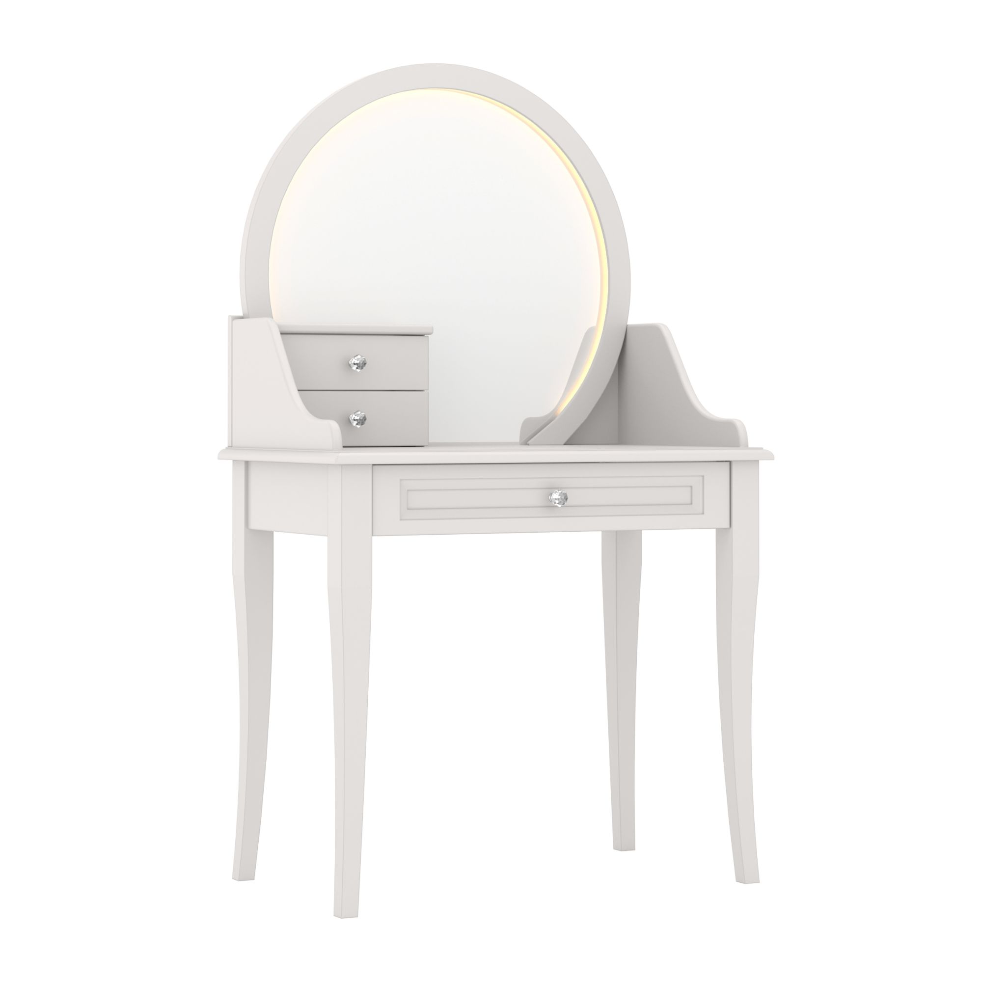 Blat wsparty został na drewnianych, starannie wyprofilowanych nóżkach, które dodają całości romantycznego charakteru. Jej wyjątkowym elementem jest okrągłe, podświetlane lustro, przy którym bez trudu wykonasz codzienną pielęgnację i makijaż. Toaletka wyposażona jest w obszerną szufladę pod biurkiem, która posiada profesjonalne prowadnice Blum Invisible. Dzięki nim szuflada otwiera się płynnie i bezgłośnie, zapewniając wygodne przechowywanie kosmetyków czy innych rzeczy codziennego użytku. Po lewej stronie toaletki znajduje się dodatkowa szafka z dwoma szufladkami, która oferuje jeszcze więcej przestrzeni do przechowywania. Możesz w niej schować swoją biżuterię, perfumy i inne drobiazgi, aby mieć je zawsze pod ręką. By podkreślić charakter glamour toaletka posiada kryształowe gałki na srebrnej stopce, które przez swój wyjątkowy design nadają całości blasku i wprowadzają dodatkowy element luksusu.