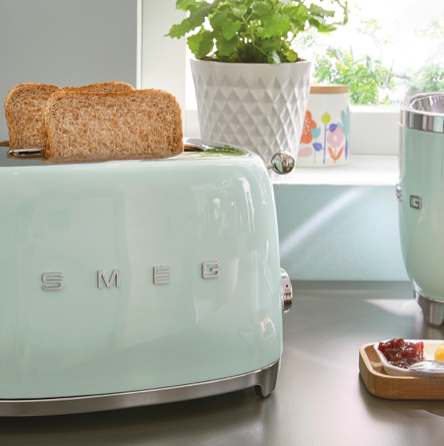 Designerski toster marki Smeg linii 50's Style w miętowym kolorze. Cała kolekcja nawiązuje do amerykańskiego stylu z lat 50-tych, czyli połączenie estetyki z ciekawym wzornictwem w stylu retro.
