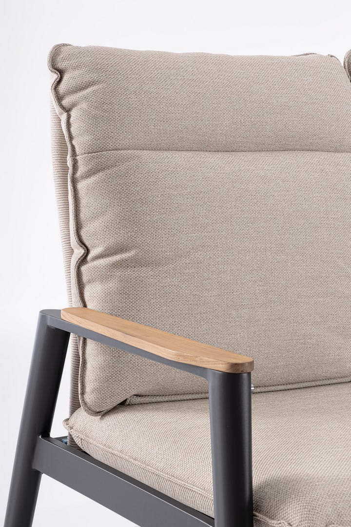 Sofa ogrodowa Miguel to doskonałe połączenie nowoczesnego designu, trwałości i funkcjonalności. Jej minimalistyczna forma uzupełniona została o eleganckie podłokietniki z wstawkami z drewna tekowego, które dodają całości naturalnego charakteru. Konstrukcja została wykonana z aluminium malowanego proszkowo, odpornego na warunki atmosferyczne, co gwarantuje trwałość na lata.