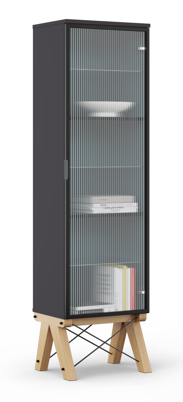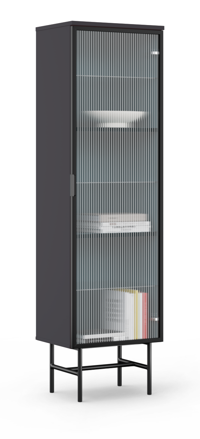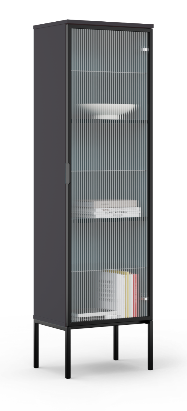 Wykonana z płyty laminowanej w kolorze czarnym i uzupełniona o subtelne, ryflowane szkło oraz czarną, metalową ramę i nogi, tworzy intrygujący kontrast materiałów. Przeszklone drzwi zapewniają lekko przymglony wgląd do wnętrza, idealnie eksponując ulubione przedmioty, jednocześnie chroniąc je przed kurzem.