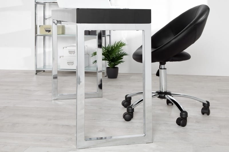 Biurko Verk ma bardzo prostą, minimalistyczną formę: czarny blat wykonany z płyty MDF osadzony na dwóch geometrycznych nogach z chromowanej stali. Wąski, zgrabny blat sprawia, że idealnie wpasuje się do niewielkich pomieszczeń. Jasny, połyskujący stelaż dodaje elegancji całej formie, dzięki czemu z pewnością trafi w gust osób ceniących minimalizm we wnętrzach.