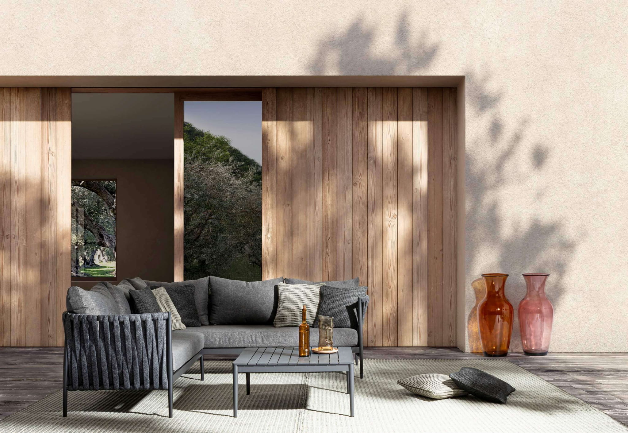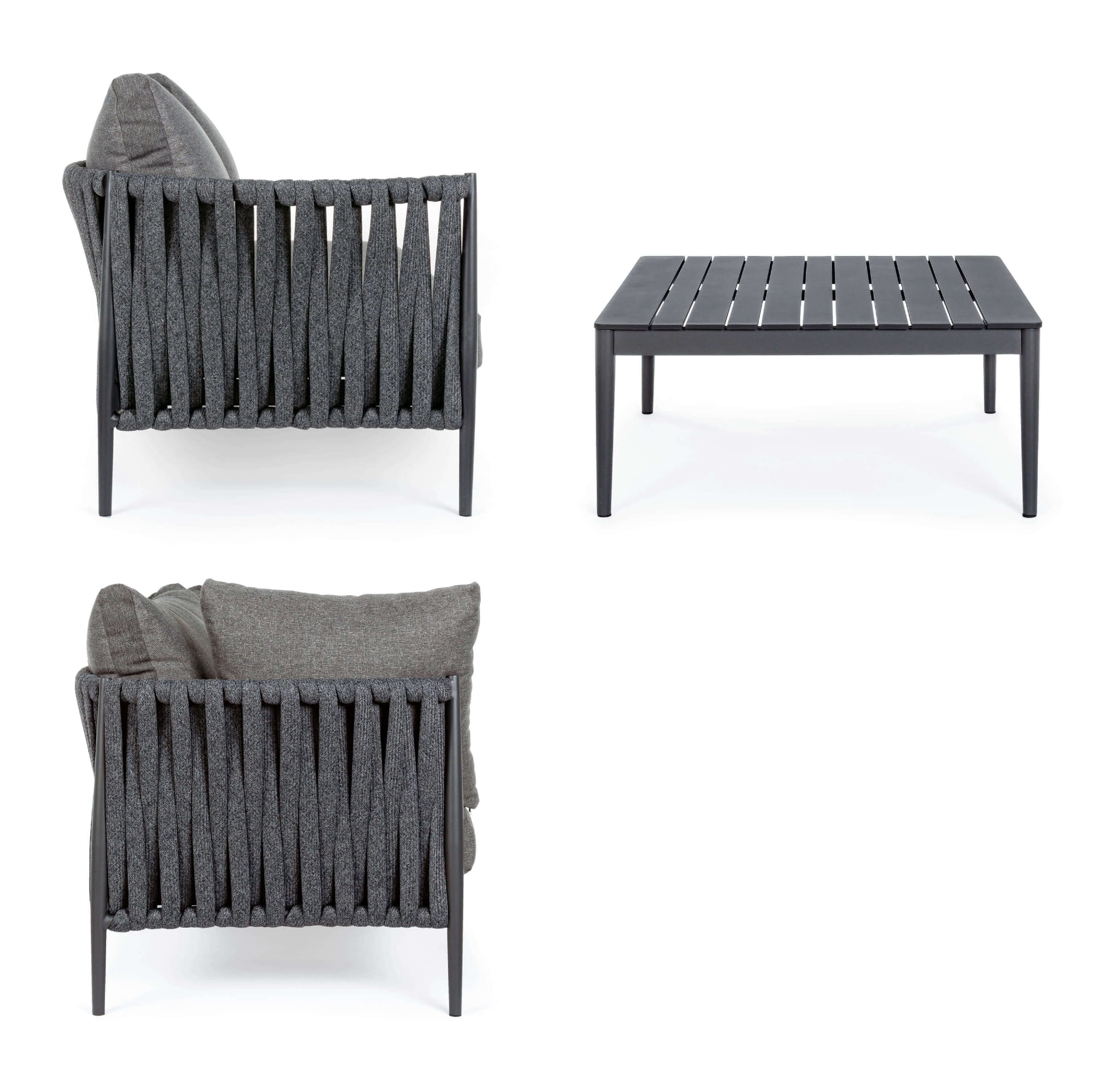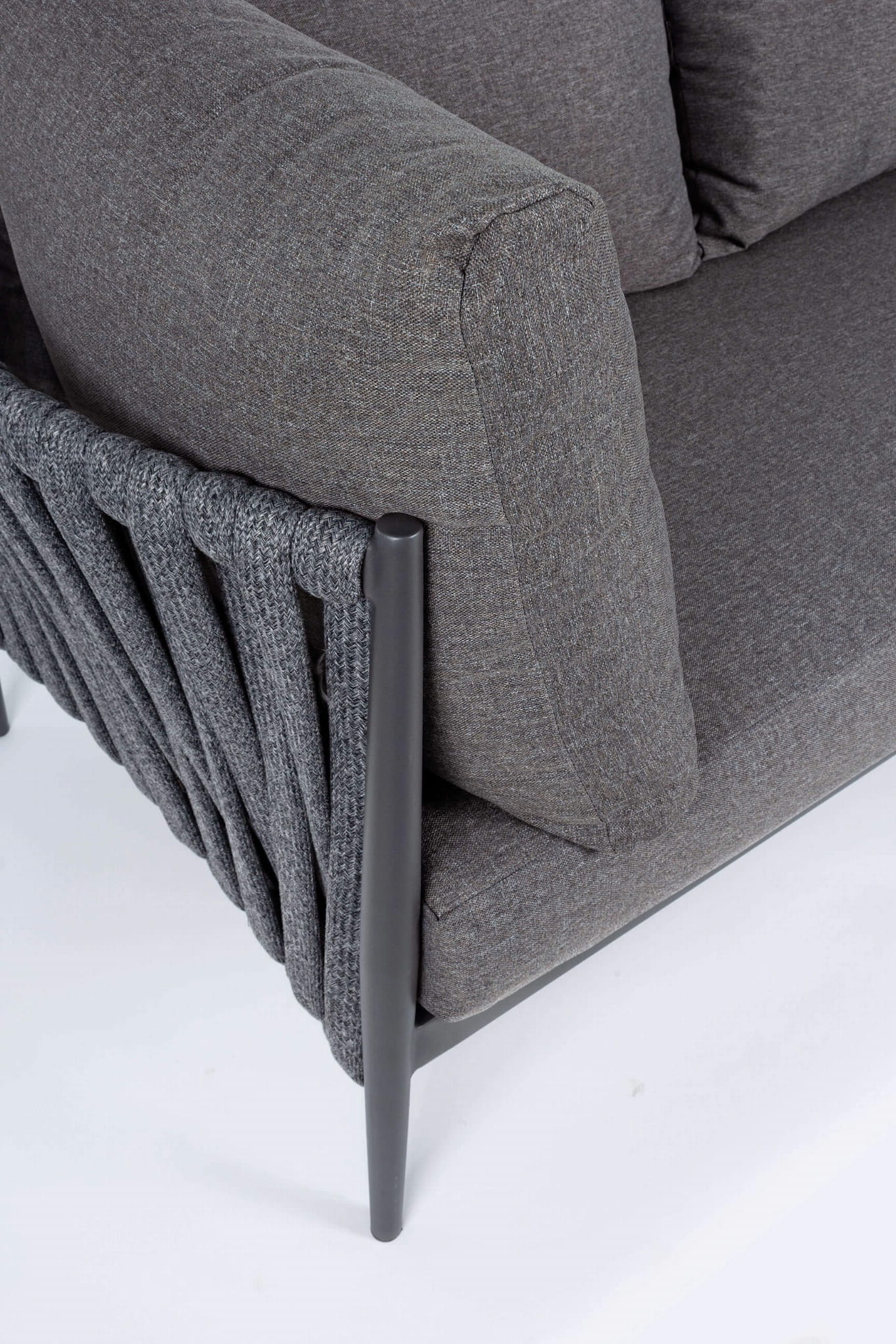Ramy mebli są wykonane z aluminium malowanego proszkowo. Poduszki posiadają zdejmowalne pokrowce z tkaniny olefinowej.