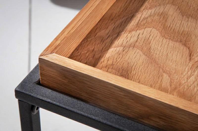 Przemyślana forma i funkcjonalność - te dwie cechy są bardzo pożądane w przypadku nowoczesnych mebli, które nierzadko wykorzystywane są na kilka sposobów. Stoliki kawowe Elements świetnie sprawdzają się w swojej prymarnej roli, ale na tym możliwości ich zastosowania się nie kończą. Ponieważ ich blaty są zdejmowane, w kilka sekund można przemienić je w podstawę pod talerze, tacę do serwowania śniadania do łóżka albo wygodną podkładkę pod laptopa - przydatną gdy zechcemy popracować z kanapy. Do wyprodukowania stolików Elements wykorzystano metal malowany proszkowo oraz płytę MDF z okleiną dębową. Sprawdzą się we wnętrzach nowoczesnych, loftowych, minimalistycznych, skandynawskich, a nawet rustykalnych.