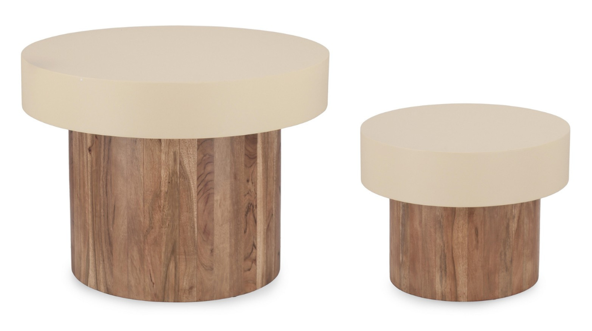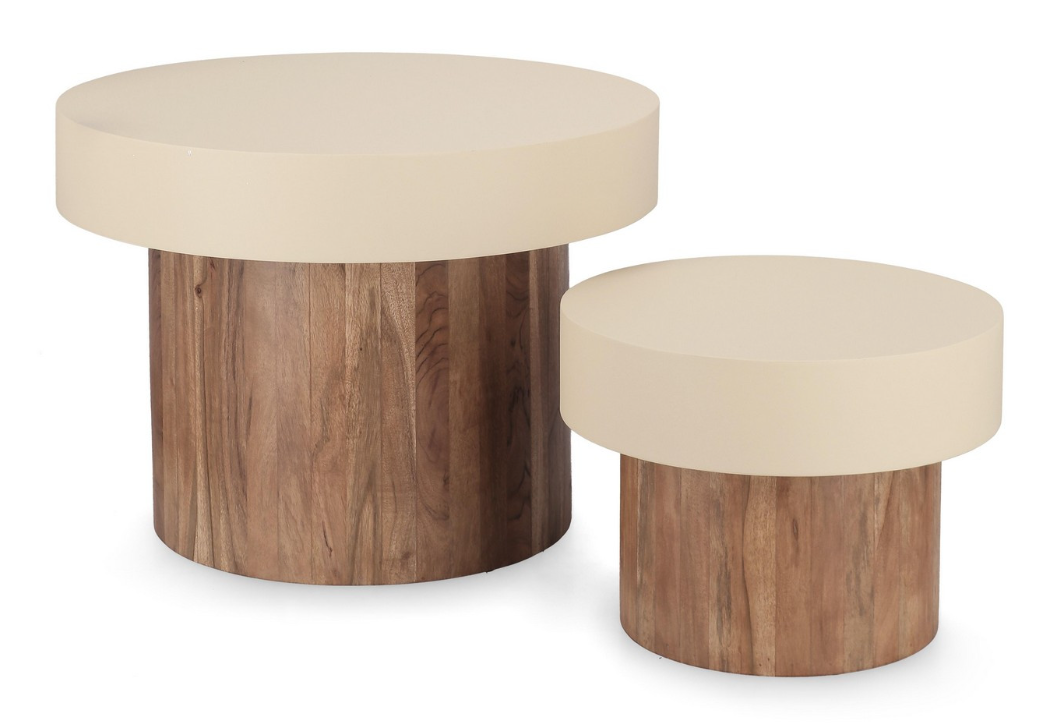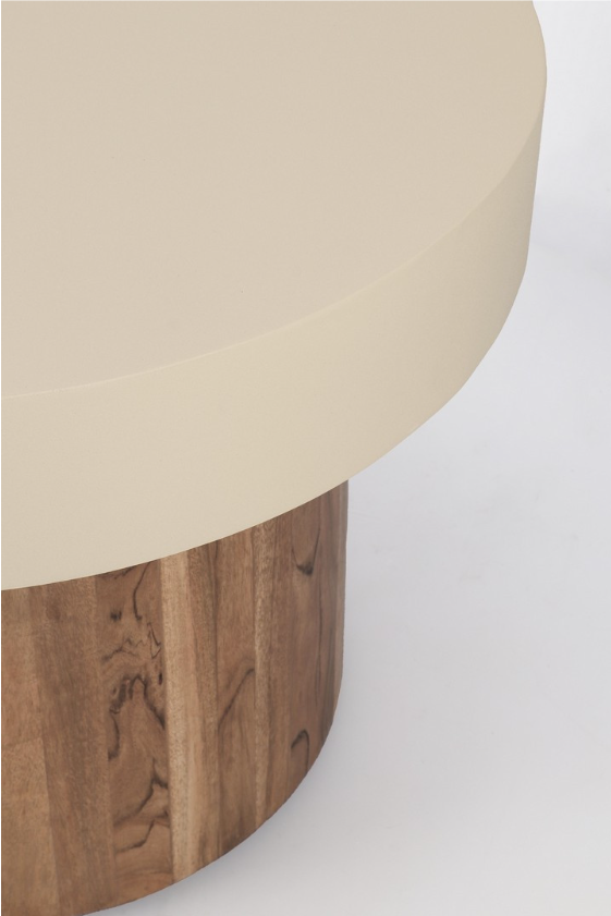 Solidną bazę każdego stolika stanowią masywne, cylindryczne podstawy wykonane z drewna akacjowego. Pionowe ułożenie drewnianych elementów eksponuje naturalne usłojenie i ciepłą barwę surowca, nadając meblom wygląd nowoczesnych totemów. Zwieńczeniem konstrukcji są gładkie, okrągłe blaty wykonane ze stali malowanej proszkowo farbą epoksydową. Jasny, kremowy kolor metalu tworzy subtelny, ale efektowny kontrast z drewnianą podstawą.