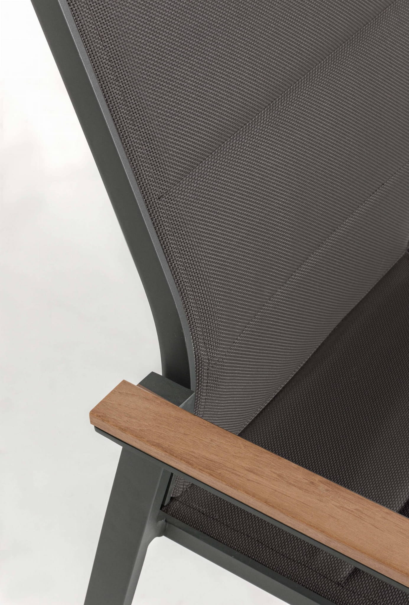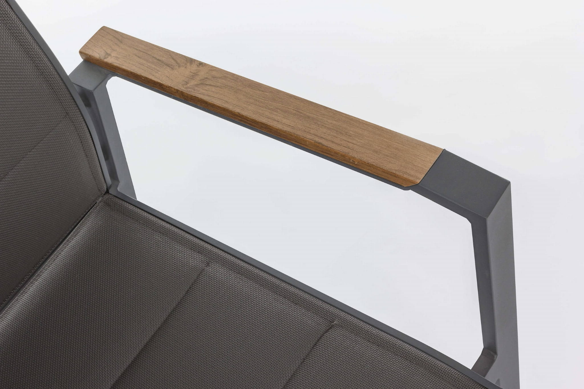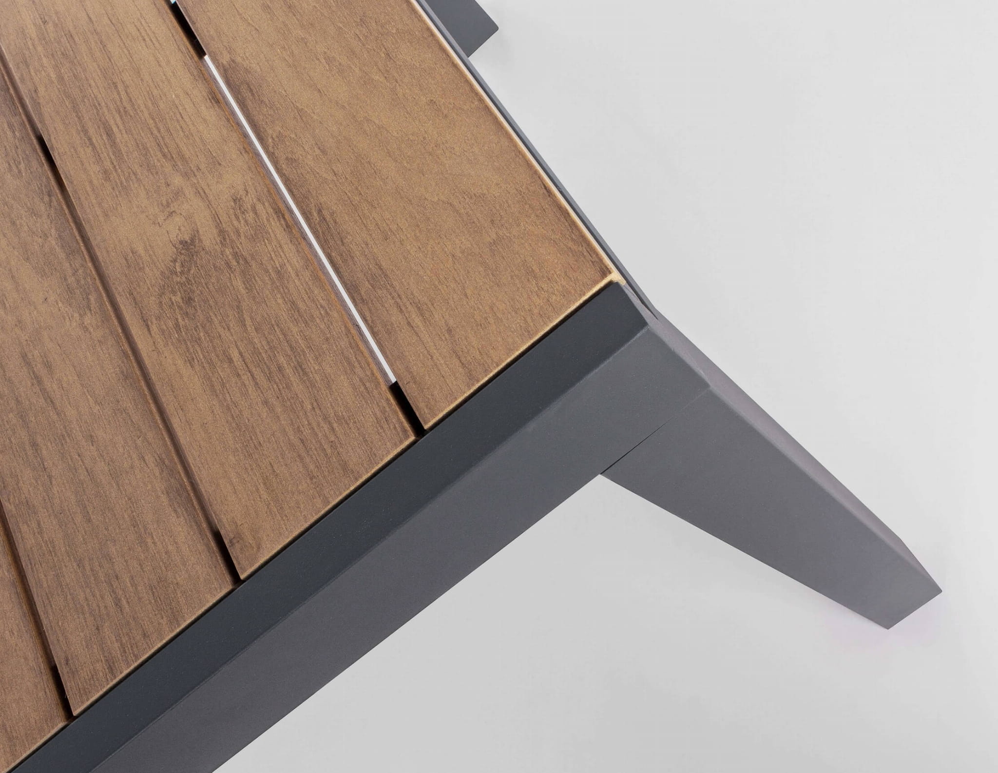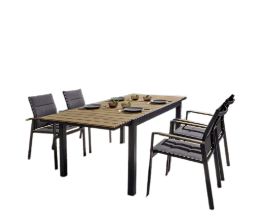 Blat stołu i podłokietniki krzeseł wykonane są z poliwęglanu (kompozytu przypominającego drewno) w kolorze teakowym, co nadaje meblom elegancji i przytulności.