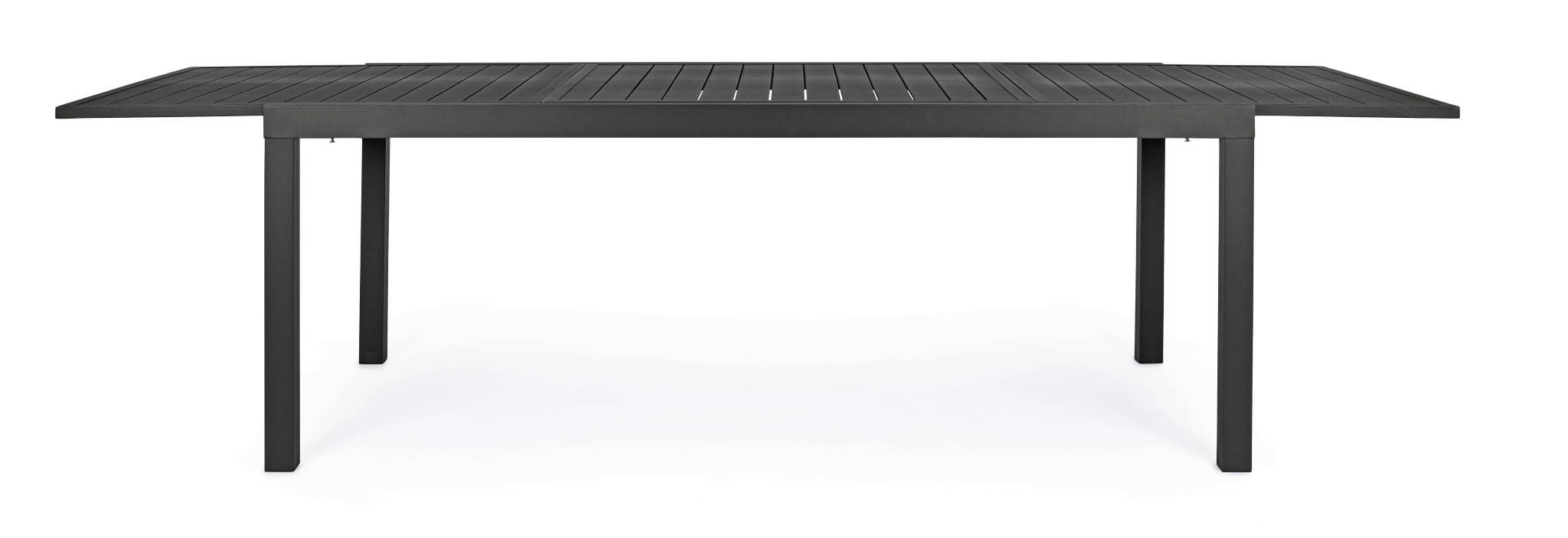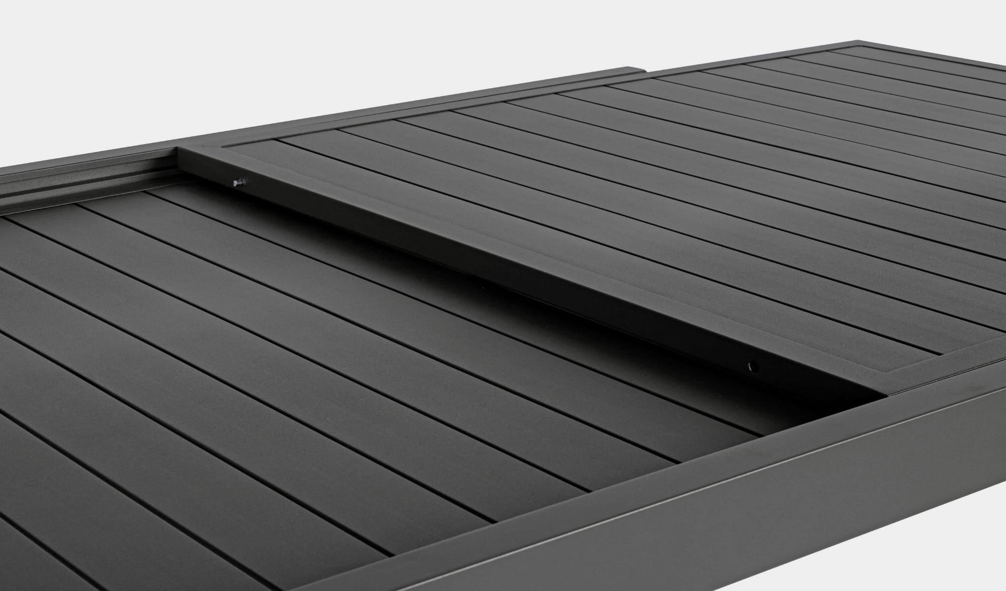 Antracytowy ogrodowy zestaw jadalniany zawiera rozkładany stół 200-300 cm oraz do wyboru osiem lub dziesięć krzeseł z tej samej kolekcji.