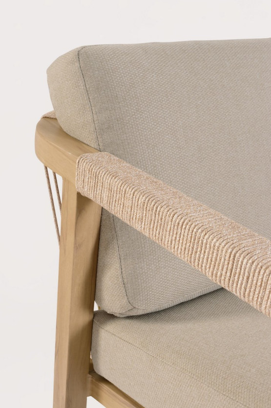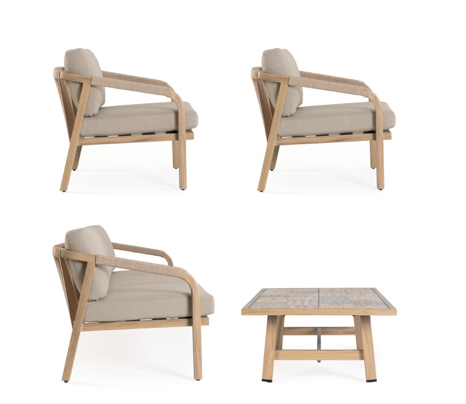 Zestaw wypoczynkowy Kalimera to luksusowa propozycja od włoskiej marki Bizzotto, która zachwyca ciepłą, naturalną kolorystyką i najwyższą jakością wykonania. Główna konstrukcja mebli została stworzona z aluminium malowanego proszkowo z efektem drewna w odcieniu naturalnym. Dzięki temu rozwiązaniu zestaw prezentuje się niezwykle przytulnie i organicznie, pozostając jednocześnie całkowicie odpornym na rdzę oraz niekorzystne warunki atmosferyczne.