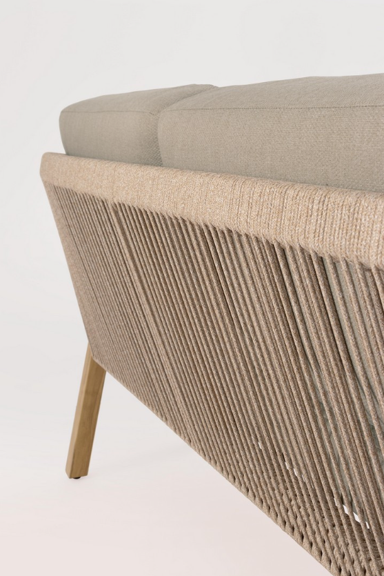 Sercem strefy relaksu jest szeroki stolik kawowy, którego blat wyłożono oryginalnymi, hiszpańskimi płytkami porcelanowymi o pięknym, wzorzystym szkliwieniu. To detal, który nadaje zestawowi unikalnego, rzemieślniczego charakteru. Oparcia i podłokietniki sofy oraz foteli wykończono gęstym przeplotem z okrągłej liny poliestrowej, co zapewnia bryłom wizualną lekkość i nowoczesny sznyt. Komfort wypoczynku gwarantują grube poduszki siedziskowe i oparciowe, obszyte wysokiej klasy wodoodporną tkaniną Olefin, którą cechuje wyjątkowa odporność na promieniowanie UV i wilgoć.