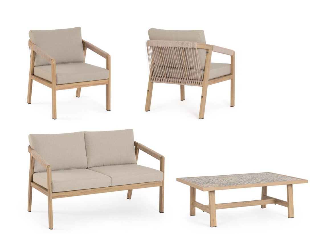 Zestaw wypoczynkowy Kalimera to luksusowa propozycja od włoskiej marki Bizzotto, która wprowadzi na Twój taras atmosferę spokoju i elegancji inspirowaną barwami natury. Solidna konstrukcja mebli została wykonana z aluminium malowanego proszkowo w naturalnym odcieniu. To innowacyjne wykończenie łączy wizualne ciepło z bezkompromisową trwałością metalu, zapewniając pełną odporność na rdzę i zmienne warunki atmosferyczne.