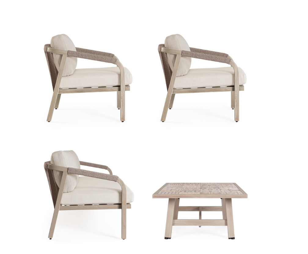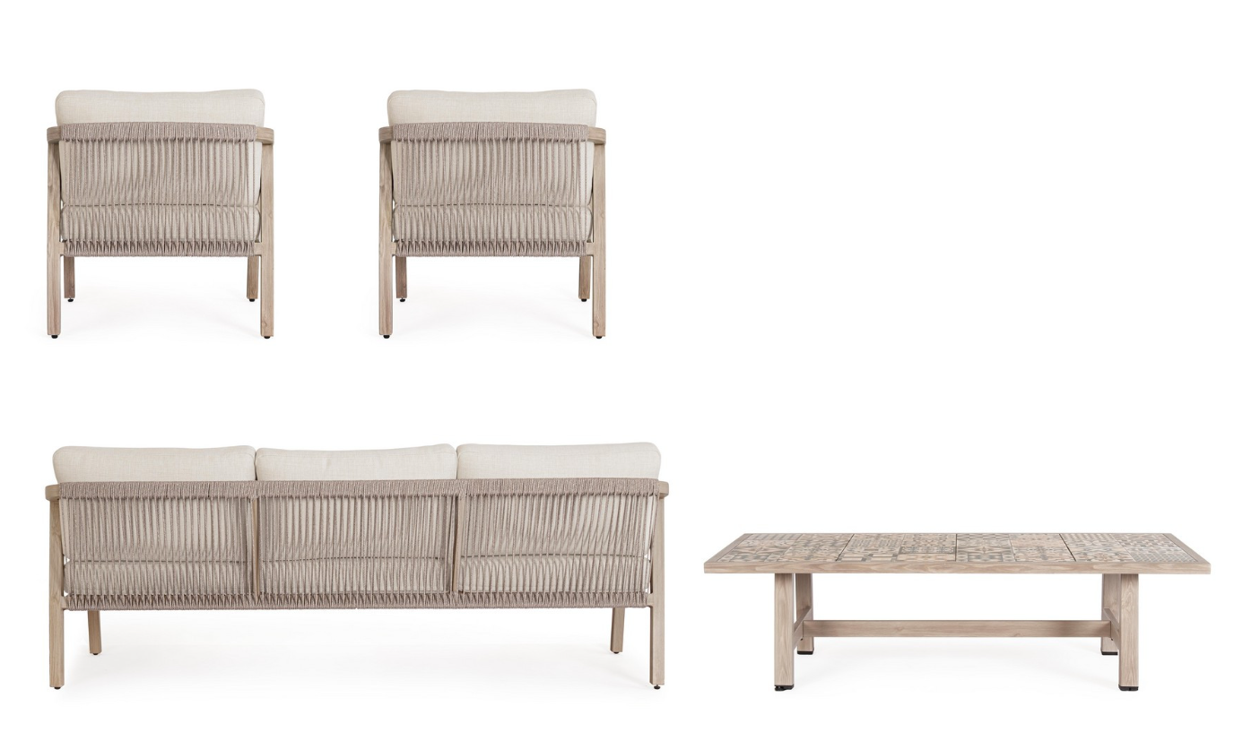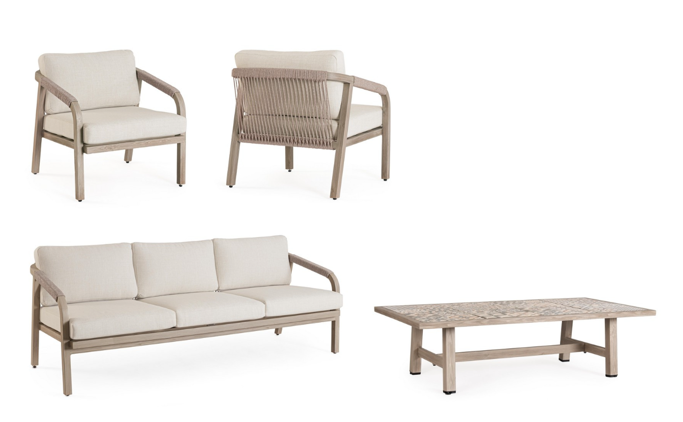 Zestaw Kalimera Timber od włoskiej marki Bizzotto to kompletna aranżacja tarasu dla pięciu osób, łącząca piaskową konstrukcję, rzemieślniczy splot i ceramiczne detale w spójną, elegancką całość.