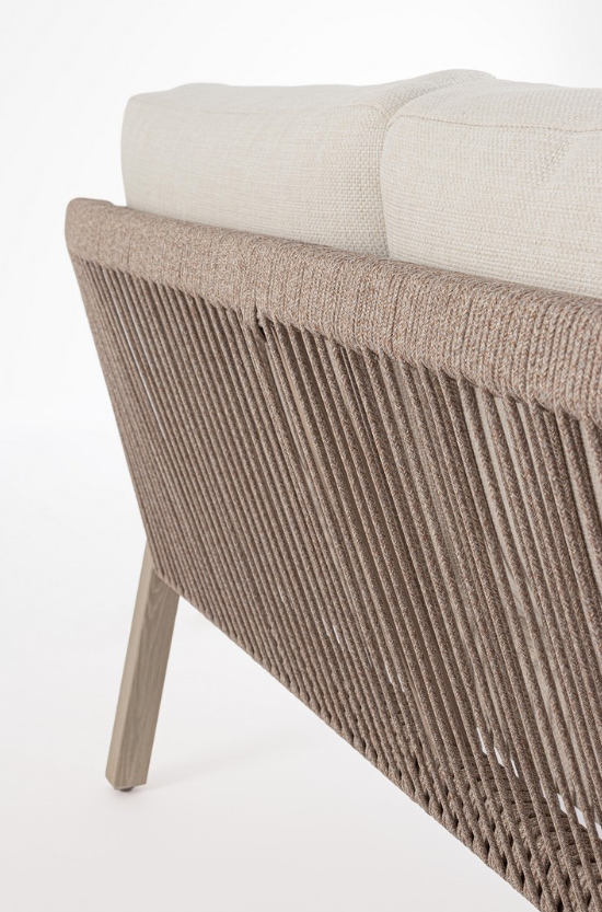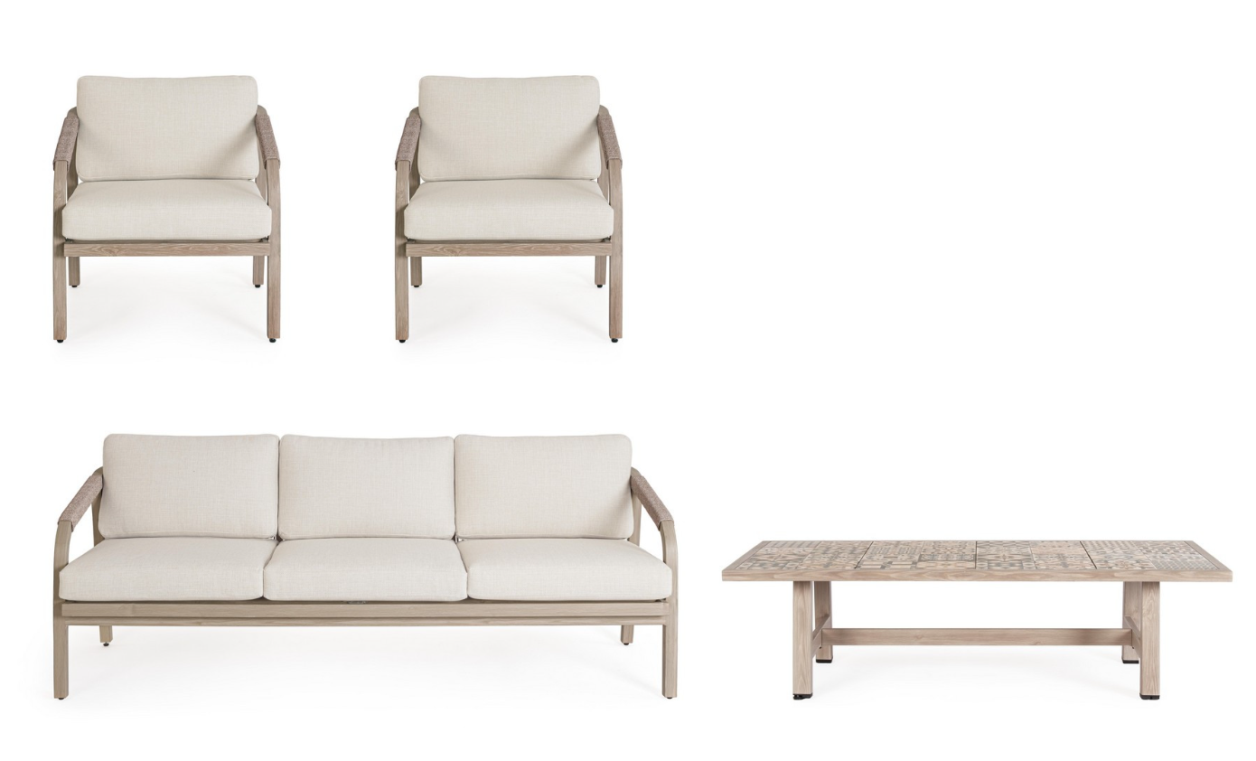 Zestaw wypoczynkowy Kalimera to luksusowa interpretacja ogrodowego salonu, która zachwyca ciepłą, piaskową kolorystyką i najwyższą jakością wykonania. Główna konstrukcja mebli została stworzona z aluminium malowanego proszkowo w piaskowym odcieniu, co nadaje im naturalnego, przytulnego wyglądu przy jednoczesnym zachowaniu całkowitej odporności na rdzę i zmienne warunki pogodowe.