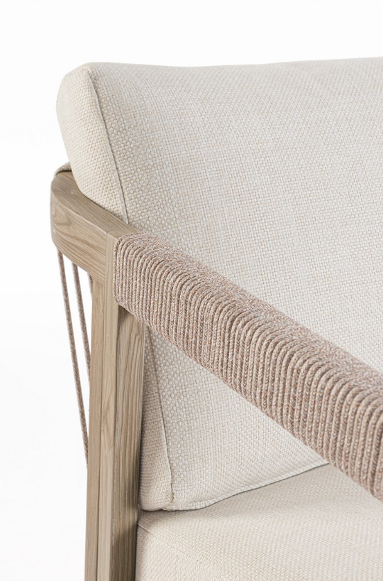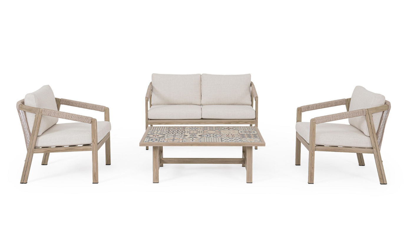 Sercem zestawu jest elegancki stolik kawowy, którego blat zdobią oryginalne, hiszpańskie płytki porcelanowe o pięknym, wzorzystym szkliwieniu. Ten rzemieślniczy detal nadaje całości unikalnego charakteru. Oparcia oraz podłokietniki sofy i foteli wykończono gęstą plecionką z okrągłej liny poliestrowej, co nadaje bryłom lekkości i nowoczesnego sznytu. Komfort wypoczynku zapewniają grube poduszki obszyte wysokiej klasy wodoodporną tkaniną Olefin. Materiał ten charakteryzuje się znakomitą odpornością na blaknięcie pod wpływem słońca oraz wilgoć, a zdejmowane pokrowce ułatwiają zachowanie mebli w nienagannej czystości.