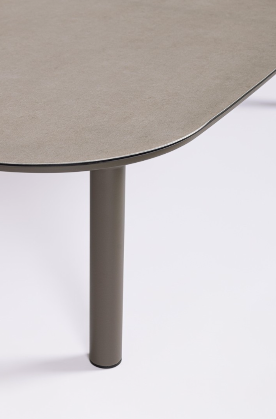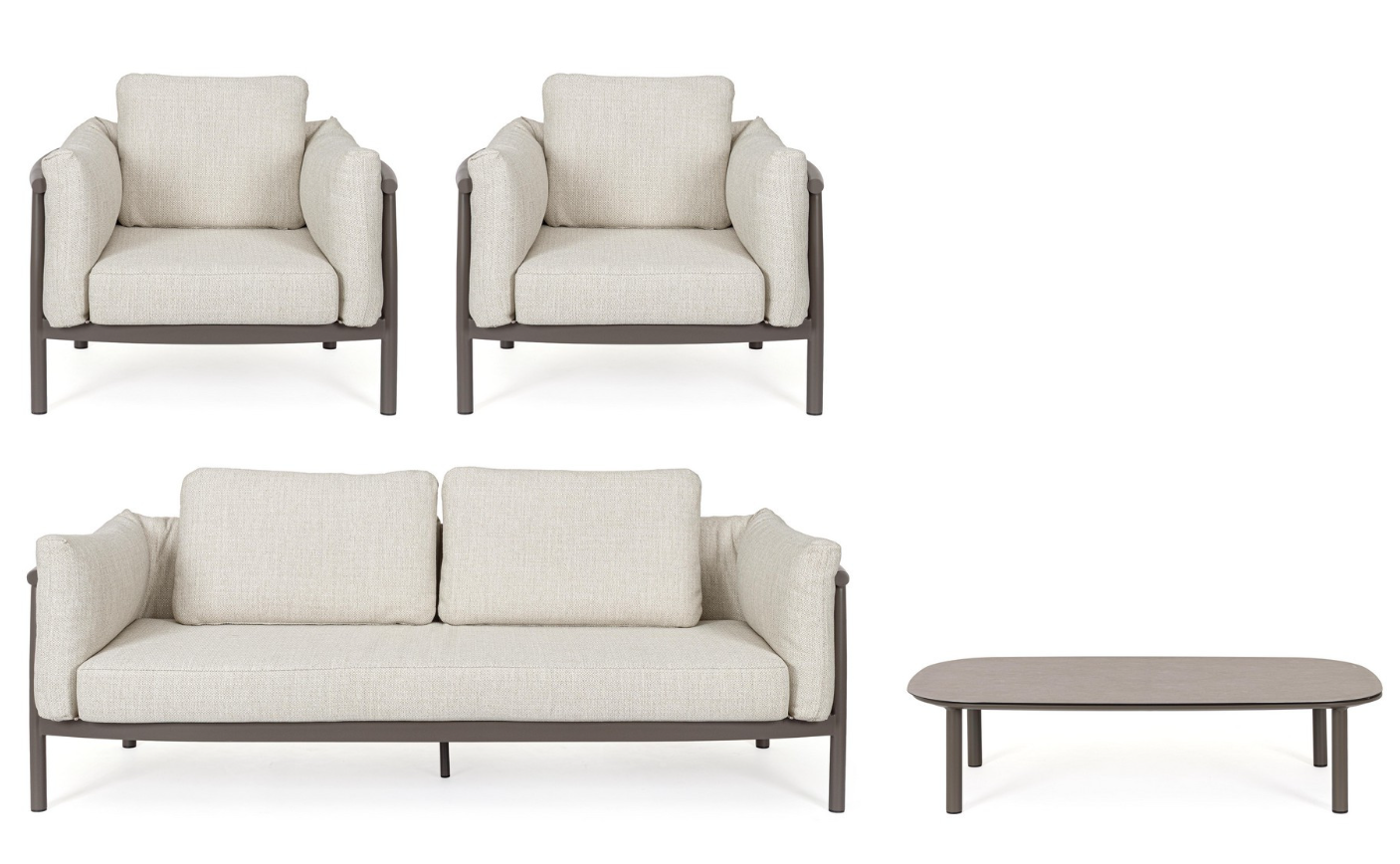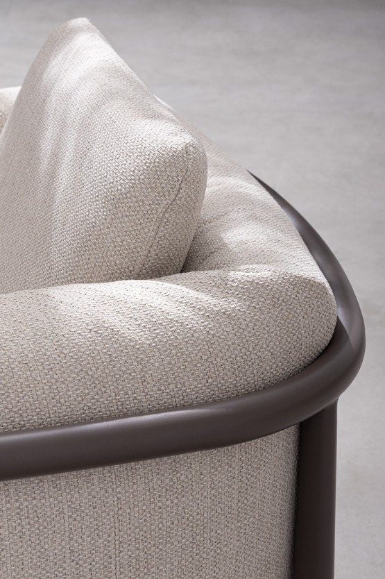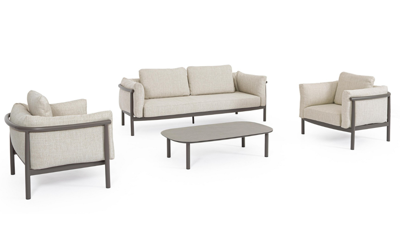 Integralną częścią strefy relaksu jest przestronny stolik kawowy, którego blat wykonano ze szlachetnego teku osadzonego na solidnej, aluminiowej ramie. Z tyłu i po bokach sofy oraz obszernych foteli zastosowano stylową plecionkę z wytrzymałych lin poliestrowych, co optycznie zamyka bryłę, zapewniając przytulne oparcie. W parze z estetyką idzie również znakomita trwałość, zagwarantowana przez odporność na rdzę oraz użycie nierdzewnych śrub.