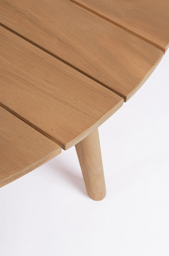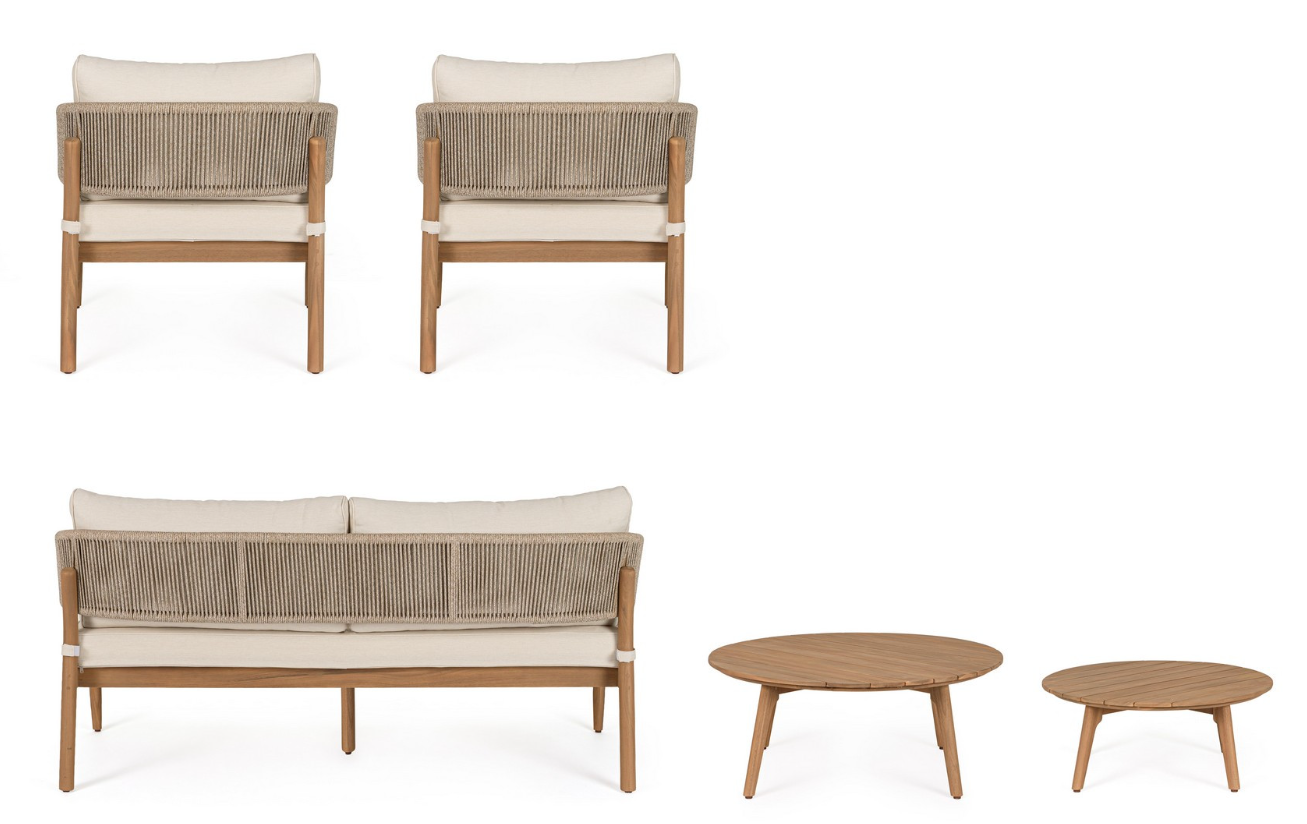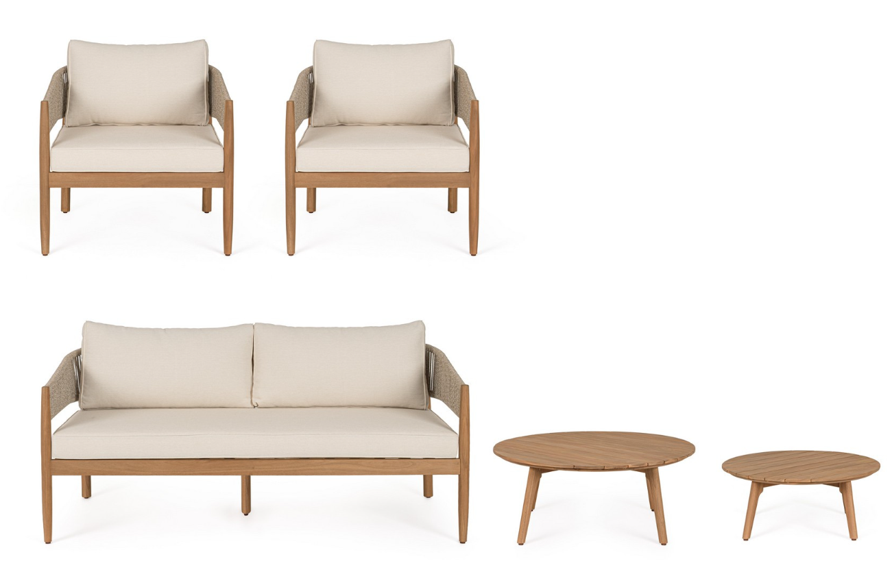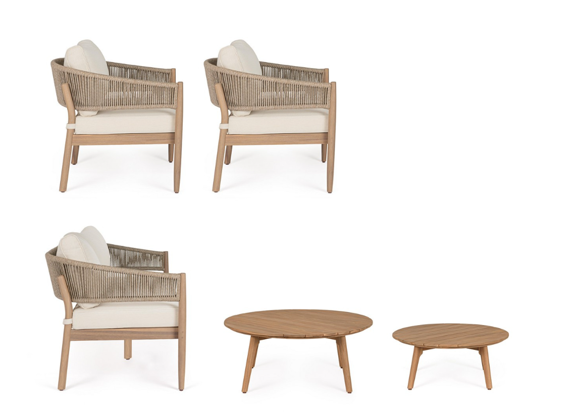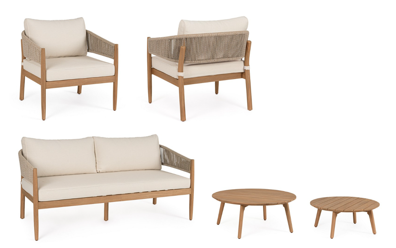Zestaw wypoczynkowy Thiago od włoskiej marki Bizzotto to wyjątkowa propozycja dla miłośników naturalnych materiałów i ponadczasowej elegancji. Solidna konstrukcja foteli i sofy oraz dwa okrągłe stoliki kawowe zostały w całości wykonane z certyfikowanego drewna akacjowego (100% FSC). Surowiec ten zabezpieczono wysokiej jakości olejem, który nadaje mu piękny, ciepły odcień nawiązujący do szlachetnego teku, jednocześnie chroniąc przed niekorzystnymi czynnikami zewnętrznymi.