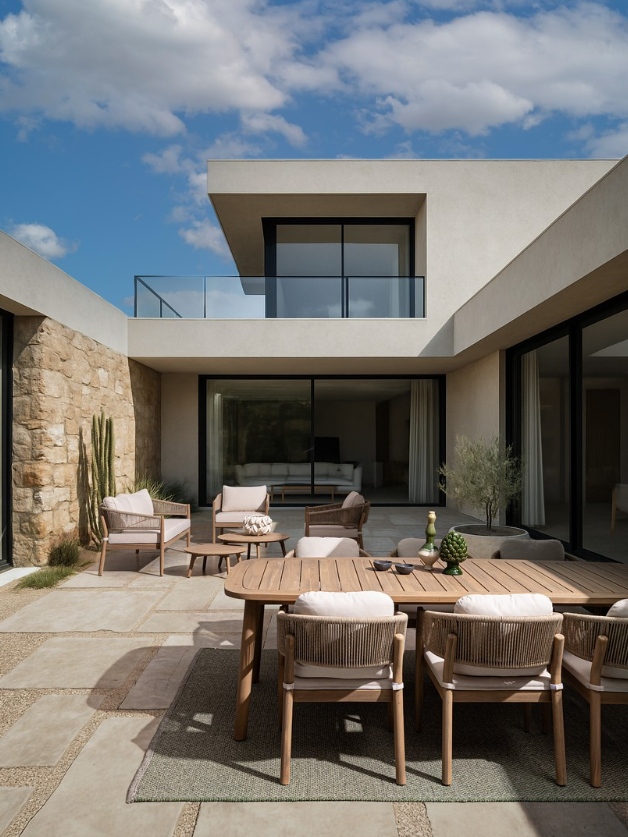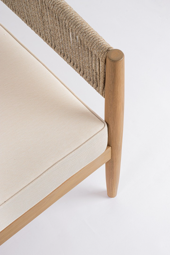 Prawdziwą ozdobą kolekcji są zaokrąglone oparcia i podłokietniki. Zbudowano je na ukrytej, aluminiowej ramie, którą misternie owinięto plecionką z liny poliestrowej. Ten rzemieślniczy akcent wspaniale współgra z naturalnym drewnem, nadając masywniejszym bryłom wizualnej lekkości i gwarantując przewiewne podparcie w upalne, letnie dni.
