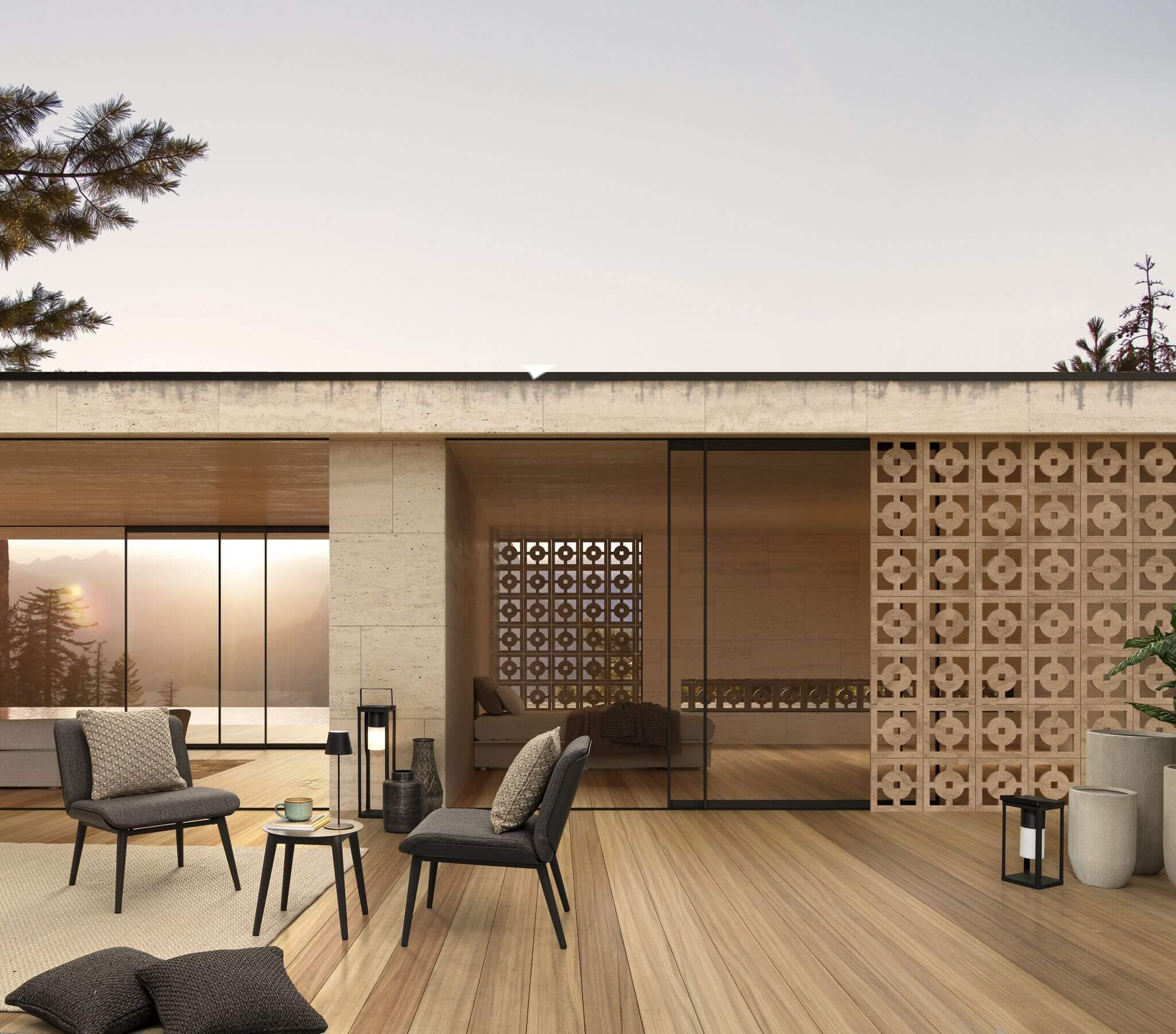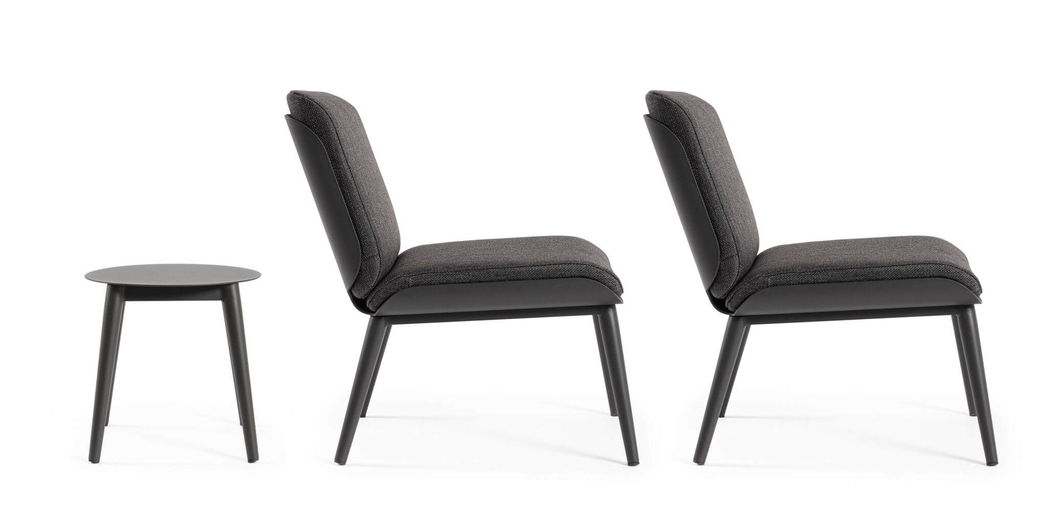 Nowoczesny zestaw do ogrodu, składający się z dwóch foteli oraz stolika kawowego. Minimalistyczna forma mebli sprawia, że zestaw prezentuje się estetycznie i stylowo.