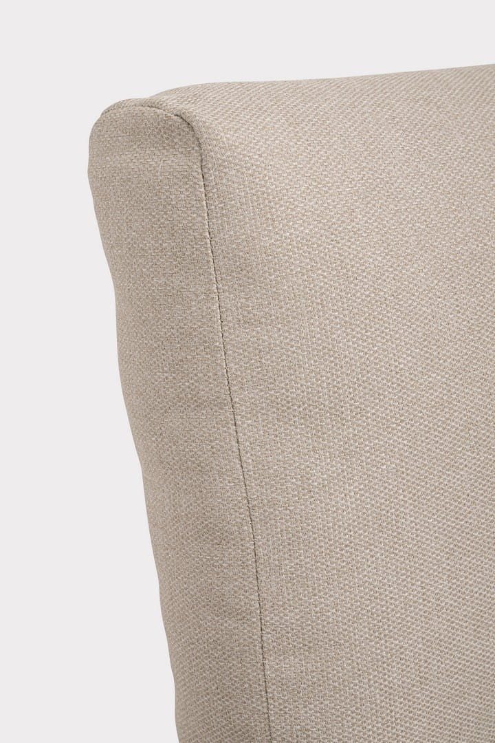 Zestaw obejmuje narożną sofę z praktycznymi bocznymi blatami oraz stolik kawowy z aluminiowym blatem wykończonym w tym samym stylu. Poduszki siedziskowe i oparciowe pokryte są tkaniną Olefin o właściwościach hydrofobowych (100% polipropylen), co gwarantuje komfort i łatwość pielęgnacji. Dodatkową zaletą są regulowane nóżki, które pozwalają na idealne dopasowanie do nierównego podłoża.