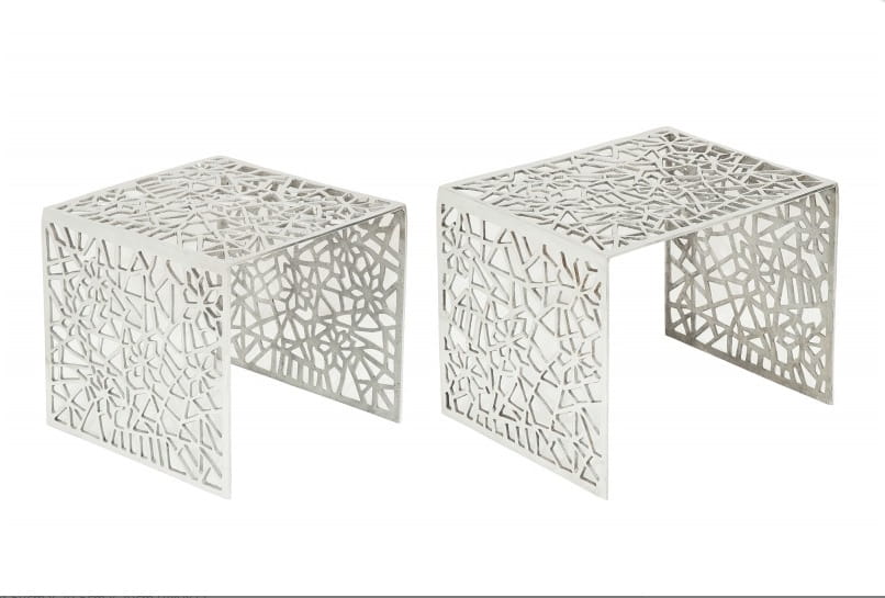 Abstract to zestaw 2 stolików różnej wielkości, które zostały ręcznie wykonane ze stopu aluminiowego w kolorze srebrnym, dzięki czemu zyskują unikatowy i niepowtarzalny design. Bez wątpienia wprowadzą do każdego wnętrza nutę dobrego stylu, a także nadadzą wyrazisty charakter wybranej przez Ciebie przestrzeni. Stoliki świetnie sprawdzą się w przestrzeniach komercyjnych, biurowych, hotelowych oraz domowych. Stoliki można wsunąć jeden w drugi oszczędzając miejsce lub rozstawić oddzielnie w razie potrzeby.