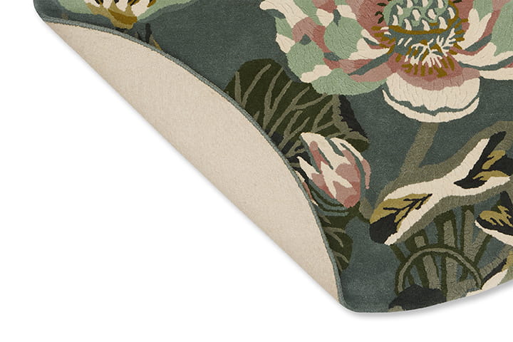Szaro Zielony Okrągły Dywan w Kwiaty – WATERLILY ROUND MIDNIGHT POND tkany jest ręcznie metodą tuftowania, co sprawia, że ma wysokie i miękkie runo.
