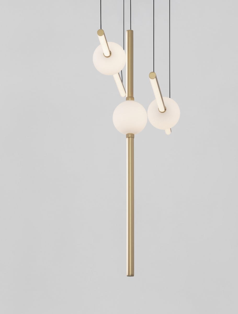 Lampa składa się z trzech kloszy, mających formę podłużnych, złotych rur, na których umieszczone zostały ozdobne kule. Kule mają biały, mleczny odcień co pięknie komponuje się ze złotą oprawą. Źródło światła LED wbudowane zostało wzdłuż całej długości klosza, dając światło o naturalnej barwie z możliwością ściemniania za pomocą zewnętrznego ściemniacza.
