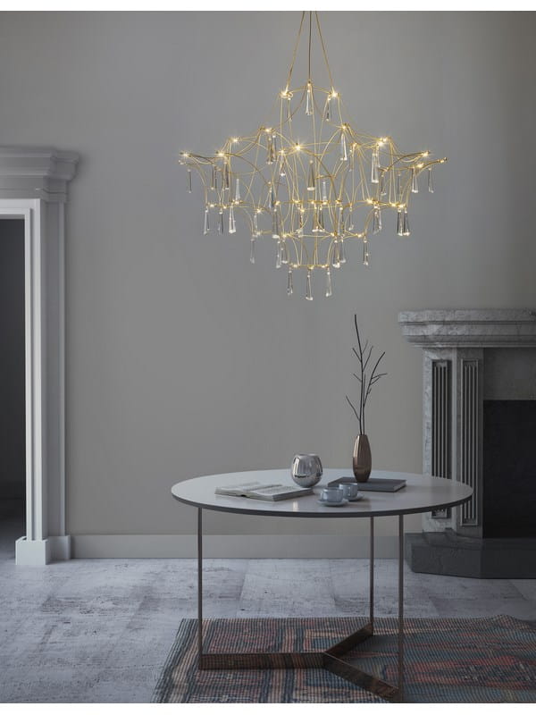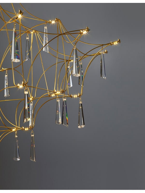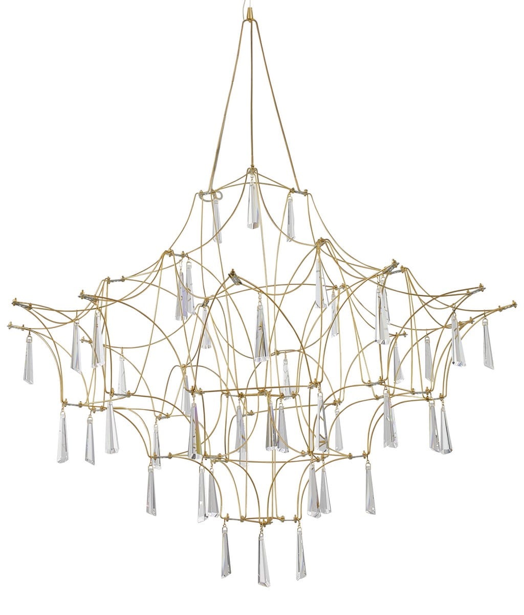 Żyrandol Salamanca Crystal charakteryzuje się delikatną, ażurową konstrukcją wykonaną z cienkich metalowych prętów w złotym kolorze. Jej misternie ułożona konstrukcja tworzy efektowną, trójwymiarową formę, która przyciąga wzrok i staje się centralnym punktem każdego pomieszczenia.